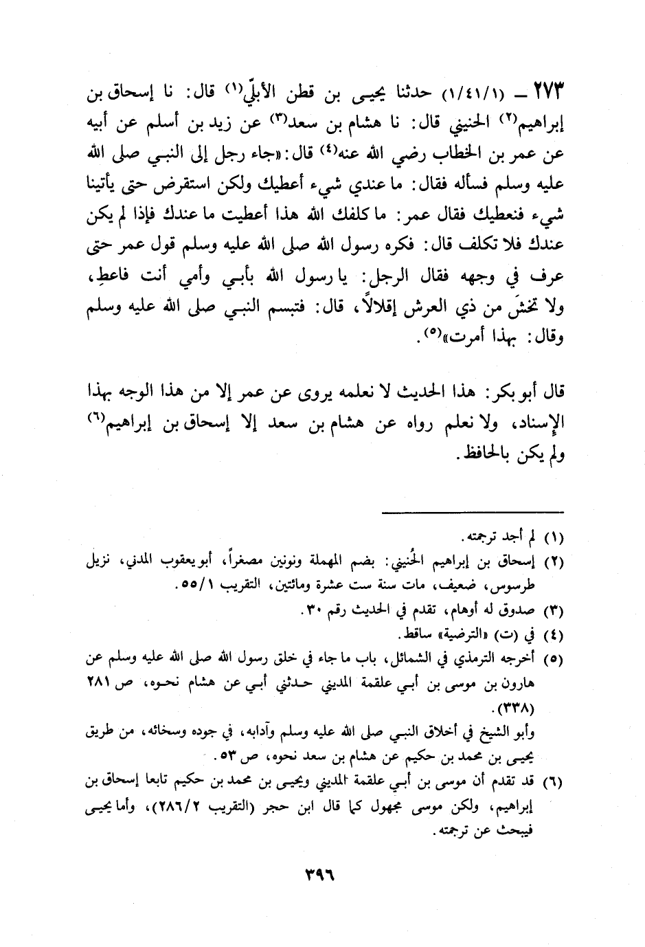 273 - حَدَّثَنَا يَحْيَى بْنُ قَطَنٍ الْأُبُلِّيُّ قَالَ: نا إِسْحَاقُ بْنُ إِبْرَاهِيمَ الْحُنَيْنِيُّ قَالَ: نا هِشَامُ بْنُ سَعْدٍ، عَنْ زَيْدِ بْنِ أَسْلَمَ، عَنْ أَبِيهِ، عَنْ عُمَرَ بْنِ الْخَطَّابِ رَضِيَ اللَّهُ عَنْهُ قَالَ: جَاءَ رَجُلٌ إِلَى النَّبِيِّ صَلَّى اللهُ عَلَيْهِ وَسَلَّمَ فَسَأَلَهُ فَقَالَ: «§مَا عِنْدِي شَيْءٌ أُعْطِيكَ، وَلَكِنِ اسْتَقْرِضْ حَتَّى يَأْتِينَا شَيْءٌ فَنُعْطِيَكَ» فَقَالَ عُمَرُ: مَا كَلَّفَكَ اللَّهُ هَذَا، أَعْطَيْتَ مَا عِنْدَكَ، فَإِذَا لَمْ يَكُنْ عِنْدَكَ فَلَا تُكَلَّفْ. قَالَ: فَكَرِهَ رَسُولُ اللَّهِ صَلَّى اللهُ عَلَيْهِ وَسَلَّمَ قَوْلَ عُمَرَ حَتَّى عُرِفَ فِي وَجْهِهِ فَقَالَ الرَّجُلُ: يَا رَسُولَ اللَّهِ بِأَبِي وَأُمِّي أَنْتَ، فَأَعْطِ وَلَا تَخْشَ مِنْ ذِي الْعَرْشِ إِقْلَالًا، قَالَ: فَتَبَسَّمَ النَّبِيُّ صَلَّى اللهُ عَلَيْهِ وَسَلَّمَ وَقَالَ: «بِهَذَا أُمِرْتُ» قَالَ أَبُو بَكْرٍ: هَذَا الْحَدِيثُ لَا نَعْلَمُهُ يُرْوَى عَنْ عُمَرَ إِلَّا مِنْ هَذَا الْوَجْهِ بِهَذَا الْإِسْنَادِ، وَلَا نَعْلَمُ رَوَاهُ عَنْ هِشَامِ بْنِ سَعْدٍ إِلَّا إِسْحَاقُ بْنُ إِبْرَاهِيمَ وَلَمْ يَكُنْ بِالْحَافِظِ