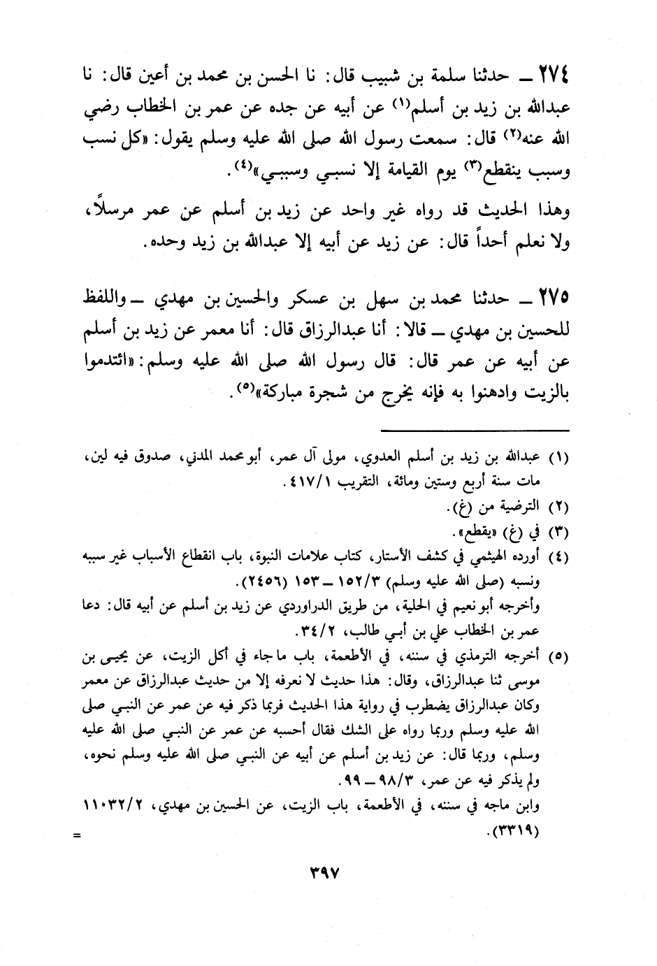 274 - حَدَّثَنَا سَلَمَةُ بْنُ شَبِيبٍ قَالَ: نا الْحَسَنُ بْنُ مُحَمَّدِ بْنِ أَعْيَنَ قَالَ: نا عَبْدُ اللَّهِ بْنُ زَيْدِ بْنِ أَسْلَمَ، عَنْ أَبِيهِ، عَنْ جَدِّهِ، عَنْ عُمَرَ بْنِ الْخَطَّابِ، رَضِيَ اللَّهُ عَنْهُ قَالَ: سَمِعْتُ رَسُولَ اللَّهِ صَلَّى اللهُ عَلَيْهِ وَسَلَّمَ يَقُولُ: «§كُلُّ نَسَبٍ وَسَبَبٍ يَنْقَطِعُ يَوْمَ الْقِيَامَةِ إِلَّا نَسَبِي وَسَبَبِي» وَهَذَا الْحَدِيثُ قَدْ رَوَاهُ غَيْرُ وَاحِدٍ عَنْ زَيْدِ بْنِ أَسْلَمَ، عَنْ عُمَرَ مُرْسَلًا، وَلَا نَعْلَمُ أَحَدًا قَالَ: عَنْ زَيْدٍ، عَنْ أَبِيهِ إِلَّا عَبْدُ اللَّهِ بْنُ زَيْدٍ وَحْدَهُ