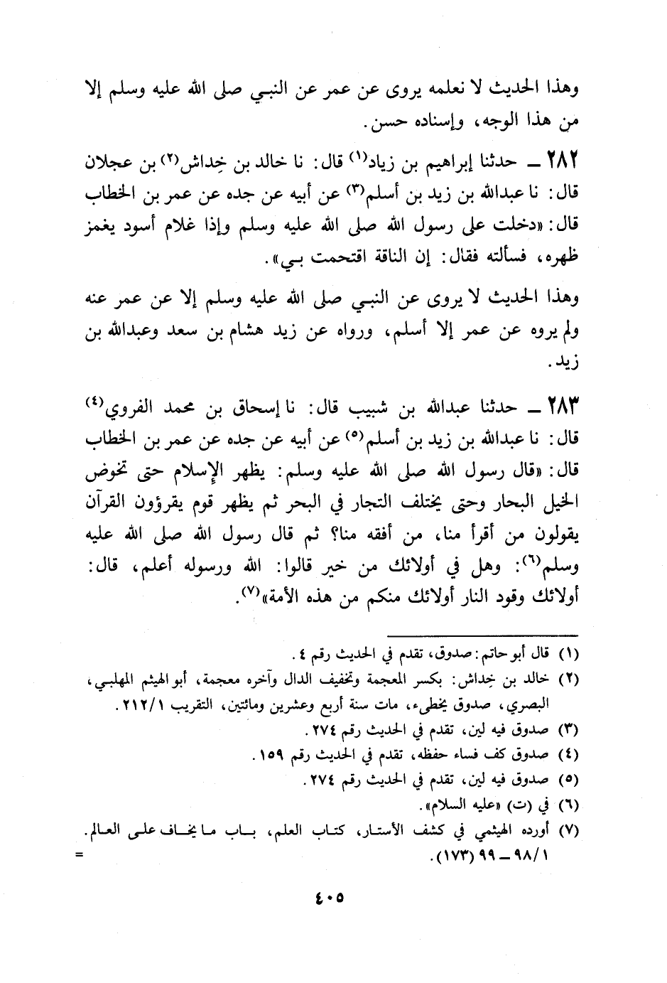 283 - حَدَّثَنَا عَبْدُ اللَّهِ بْنُ شَبِيبٍ قَالَ: نا إِسْحَاقُ بْنُ مُحَمَّدٍ الْفَرْوِيُّ، قَالَ: نا عَبْدُ اللَّهِ بْنُ زَيْدِ بْنِ أَسْلَمَ، عَنْ أَبِيهِ، عَنْ جَدِّهِ، عَنْ عُمَرَ بْنِ الْخَطَّابِ قَالَ: قَالَ رَسُولُ اللَّهِ صَلَّى اللهُ عَلَيْهِ وَسَلَّمَ: " §يَظْهَرُ الْإِسْلَامُ حَتَّى تَخُوضَ الْخَيْلُ الْبِحَارَ، وَحَتَّى يَخْتَلِفُ التُّجَّارُ فِي الْبَحْرِ، ثُمَّ يَظْهَرُ قَوْمٌ يَقْرَءُونَ الْقُرْآنَ يَقُولُونَ: مَنْ أَقْرَأُ مِنَّا؟ مَنْ أَفْقَهُ مِنَّا؟ " ثُمَّ قَالَ رَسُولُ اللَّهِ صَلَّى اللهُ عَلَيْهِ وَسَلَّمَ: " وَهَلْ فِي أُولَئِكَ مِنْ خَيْرٍ؟ قَالُوا: اللَّهُ وَرَسُولُهُ أَعْلَمُ قَالَ: «أُولَئِكَ وَقُودُ النَّارِ أُولَئِكَ مِنْكُمْ، مِنْ هَذِهِ الْأُمَّةِ»
