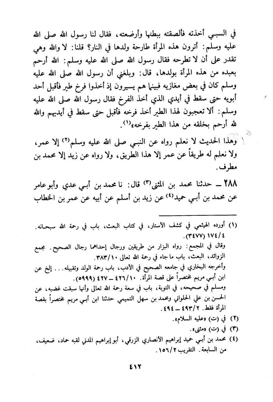 قَالَ: وَبَلَغَنِي أَنَّ رَسُولَ اللَّهِ صَلَّى اللهُ عَلَيْهِ وَسَلَّمَ كَانَ فِي بَعْضِ مَغَازِيهِ فَبَيْنَمَا هُمْ يَسِيرُونَ إِذْ أَخَذُوا فَرْخَ طَيْرٍ فَأَقْبَلَ أَحَدُ أَبَوَيْهِ حَتَّى سَقَطَ فِي أَيْدِي الَّذِي أَخَذَ الْفَرْخَ فَقَالَ رَسُولُ اللَّهِ صَلَّى اللهُ عَلَيْهِ وَسَلَّمَ: «§أَلَا تَعْجَبُونَ لِهَذَا الطَّيْرِ أُخِذَ فَرْخُهُ فَأَقْبَلَ حَتَّى سَقَطَ فِي أَيْدِيهِمْ، وَاللَّهِ لَلَّهُ أَرْحَمُ بِخَلْقِهِ مِنْ هَذَا الطَّيْرِ بِفَرْخِهِ» وَهَذَا الْحَدِيثُ لَا نَعْلَمُ رَوَاهُ عَنِ النَّبِيِّ صَلَّى اللهُ عَلَيْهِ وَسَلَّمَ إِلَّا عُمَرُ، وَلَا نَعْلَمُ لَهُ طَرِيقًا عَنْ عُمَرَ إِلَّا هَذَا الطَّرِيقُ وَلَا رَوَاهُ عَنْ زَيْدٍ إِلَّا مُحَمَّدُ بْنُ مُطَرِّفٍ
