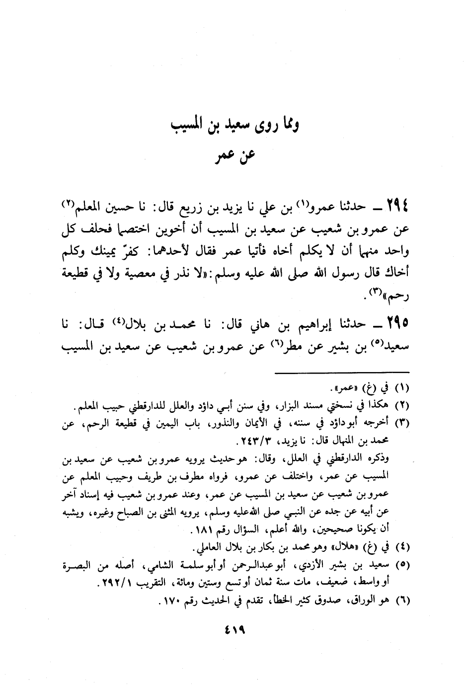294 - حَدَّثَنَا عَمْرُو بْنُ عَلِيٍّ، نا يَزِيدُ بْنُ زُرَيْعٍ قَالَ: نا حُسَيْنٌ الْمُعَلِّمُ، عَنْ عَمْرِو بْنِ شُعَيْبٍ، عَنْ سَعِيدِ بْنِ الْمُسَيِّبِ: أَنَّ أَخَوَيْنِ اخْتَصَمَا فَحَلَفَ كُلُّ وَاحِدٍ مِنْهُمَا أَنْ لَا يُكَلِّمَ أَخَاهُ، فَأَتَيَا عُمَرَ فَقَالَ لِأَحَدِهِمَا: كَفِّرْ يَمِينَكَ، وَكَلِّمْ أَخَاكَ، قَالَ رَسُولُ اللَّهِ صَلَّى اللهُ عَلَيْهِ وَسَلَّمَ: «§لَا نَذْرَ فِي مَعْصِيَةٍ وَلَا فِي قَطِيعَةِ رَحِمٍ»