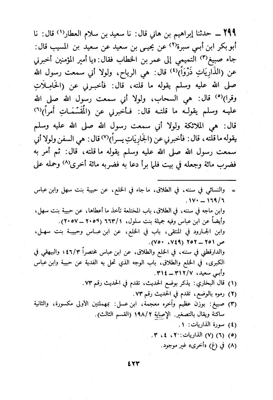 299 - حَدَّثَنَا إِبْرَاهِيمُ بْنُ هَانِي قَالَ: نا سَعِيدُ بْنُ سَلَّامٍ الْعَطَّارُ، قَالَ: نا أَبُو بَكْرِ بْنُ أَبِي سَبْرَةَ، عَنْ يَحْيَى بْنِ سَعِيدٍ، عَنْ سَعِيدِ بْنِ الْمُسَيِّبِ، قَالَ: جَاءَ صَبِيغٌ التَّمِيمِيُّ إِلَى عُمَرَ بْنِ الْخَطَّابِ فَقَالَ: يَا أَمِيرَ الْمُؤْمِنِينَ §أَخْبِرْنِي عَنِ {الذَّارِيَاتِ ذَرْوًا} [الذاريات: 1] ، قَالَ: هِيَ الرِّيَاحُ وَلَوْلَا أَنِّي سَمِعْتُ رَسُولَ اللَّهِ صَلَّى اللهُ عَلَيْهِ وَسَلَّمَ يَقُولُهُ مَا قُلْتُهُ. قَالَ: فَأَخْبِرْنِي عَنِ {الْحَامِلَاتِ وِقْرًا} قَالَ: هِيَ السَّحَابُ، وَلَوْلَا أَنِّي سَمِعْتُ رَسُولَ اللَّهِ صَلَّى اللهُ عَلَيْهِ وَسَلَّمَ يَقُولُهُ مَا قُلْتُهُ. قَالَ: فَأَخْبِرْنِي عَنِ {الْمُقَسِّمَاتِ أَمْرًا} ، قَالَ: «هِيَ الْمَلَائِكَةُ، وَلَوْلَا أَنِّي سَمِعْتُ رَسُولَ اللَّهِ صَلَّى اللهُ عَلَيْهِ وَسَلَّمَ يَقُولُهُ مَا قُلْتُهُ» قَالَ: فَأَخْبِرْنِي عَنِ {الْجَارِيَاتِ يُسْرًا} ، قَالَ: هِيَ السُّفُنُ، وَلَوْلَا أَنِّي سَمِعْتُ رَسُولَ اللَّهِ صَلَّى اللهُ عَلَيْهِ وَسَلَّمَ يَقُولُهُ مَا قُلْتُهُ " قَالَ: ثُمَّ أَمَرَ بِهِ فَضُرِبَ مِائَةً وَجَعَلَهُ فِي بَيْتٍ، فَلَمَّا بَرِئَ دَعَا بِهِ فَضَرَبَهُ مِائَةً أُخْرَى وَحَمَلَهُ عَلَى -[424]- قَتَبٍ وَكَتَبَ إِلَى أَبِي مُوسَى الْأَشْعَرِيِّ: امْنَعِ النَّاسَ مِنْ مُجَالَسَتِهِ، فَلَمْ يَزَلْ كَذَلِكَ حَتَّى أَتَى أَبَا مُوسَى فَحَلَفَ لَهُ بِالْأَيْمَانِ الْمُغَلَّظَةِ مَا يَجِدُ فِي نَفْسِهِ مِمَّا كَانَ يَجِدُ شَيْئًا، فَكَتَبَ فِي ذَلِكَ إِلَى عُمَرَ، فَكَتَبَ عُمَرُ: مَا أَخَالُهُ إِلَّا قَدْ صَدَقَ، فَخَلِّ بَيْنَهُ وَبَيْنَ مُجَالَسَتِهِ النَّاسَ " وَهَذَا الْحَدِيثُ لَا نَعْلَمُهُ يُرْوَى عَنِ النَّبِيِّ صَلَّى اللهُ عَلَيْهِ وَسَلَّمَ مِنْ وَجْهٍ مِنَ الْوُجُوهِ إِلَّا مِنْ هَذَا الْوَجْهِ، وَإِنَّمَا أَتَى مِنْ أَبِي بَكْرِ بْنِ أَبِي سَبْرَةَ فِيمَا أَحْسَبُ لِأَنَّ أَبَا بَكْرٍ لَيِّنُ الْحَدِيثِ وَسَعِيدُ بْنُ سَلَّامٍ لَمْ يَكُنْ مِنْ أَصْحَابِ الْحَدِيثِ، وَإِنَّمَا ذَكَرْتُ هَذَا الْحَدِيثَ إِذْ لَمْ أَحْفَظْهُ عَنْ رَسُولِ اللَّهِ صَلَّى اللهُ عَلَيْهِ وَسَلَّمَ إِلَّا مِنْ هَذَا الْوَجْهِ، فَذَكَرْتُهُ وَبَيَّنْتُ الْعِلَّةَ فِيهِ