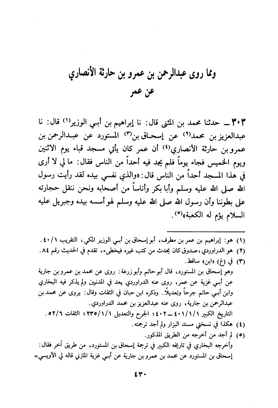 303 - حَدَّثَنَا مُحَمَّدُ بْنُ الْمُثَنَّى قَالَ: نا إِبْرَاهِيمُ بْنُ أَبِي الْوَزِيرِ قَالَ: نا عَبْدُ الْعَزِيزِ بْنُ مُحَمَّدٍ، عَنْ إِسْحَاقَ بْنِ الْمُسْتَوْرِدِ، عَنْ عَبْدِ الرَّحْمَنِ بْنِ عَمْرِو بْنِ حَارِثَةَ الْأَنْصَارِيِّ: أَنَّ عُمَرَ، §كَانَ يَأْتِي مَسْجِدَ قُبَاءَ يَوْمَ الِاثْنَيْنِ وَيَوْمَ الْخَمِيسِ فَجَاءَ يَوْمًا فَلَمْ يَجِدْ فِيهِ أَحَدًا مِنَ النَّاسِ فَقَالَ: " مَالِي لَا أَرَى فِي هَذَا الْمَسْجِدِ أَحَدًا مِنَ النَّاسِ؟ قَالَ: وَالَّذِي نَفْسِي بِيَدِهِ لَقَدْ رَأَيْتُ رَسُولَ اللَّهِ صَلَّى اللهُ عَلَيْهِ وَسَلَّمَ وَأَبَا بَكْرٍ وَأُنَاسًا مِنْ أَصْحَابِهِ، وَنَحْنُ نَنْقُلُ حِجَارَتَهُ عَلَى بُطُونِنَا وَإِنَّ رَسُولَ اللَّهِ صَلَّى اللهُ عَلَيْهِ وَسَلَّمَ لَهُوَ أَسَّسَهُ بِيَدِهِ وَجِبْرِيلُ عَلَيْهِ السَّلَامُ يَؤُمُّ لَهُ الْكَعْبَةَ " -[431]- وَهَذَا الْحَدِيثُ لَا نَعْلَمُهُ يُرْوَى عَنِ النَّبِيِّ صَلَّى اللهُ عَلَيْهِ وَسَلَّمَ إِلَّا مِنْ هَذَا الْوَجْهِ بِهَذَا الْإِسْنَادِ