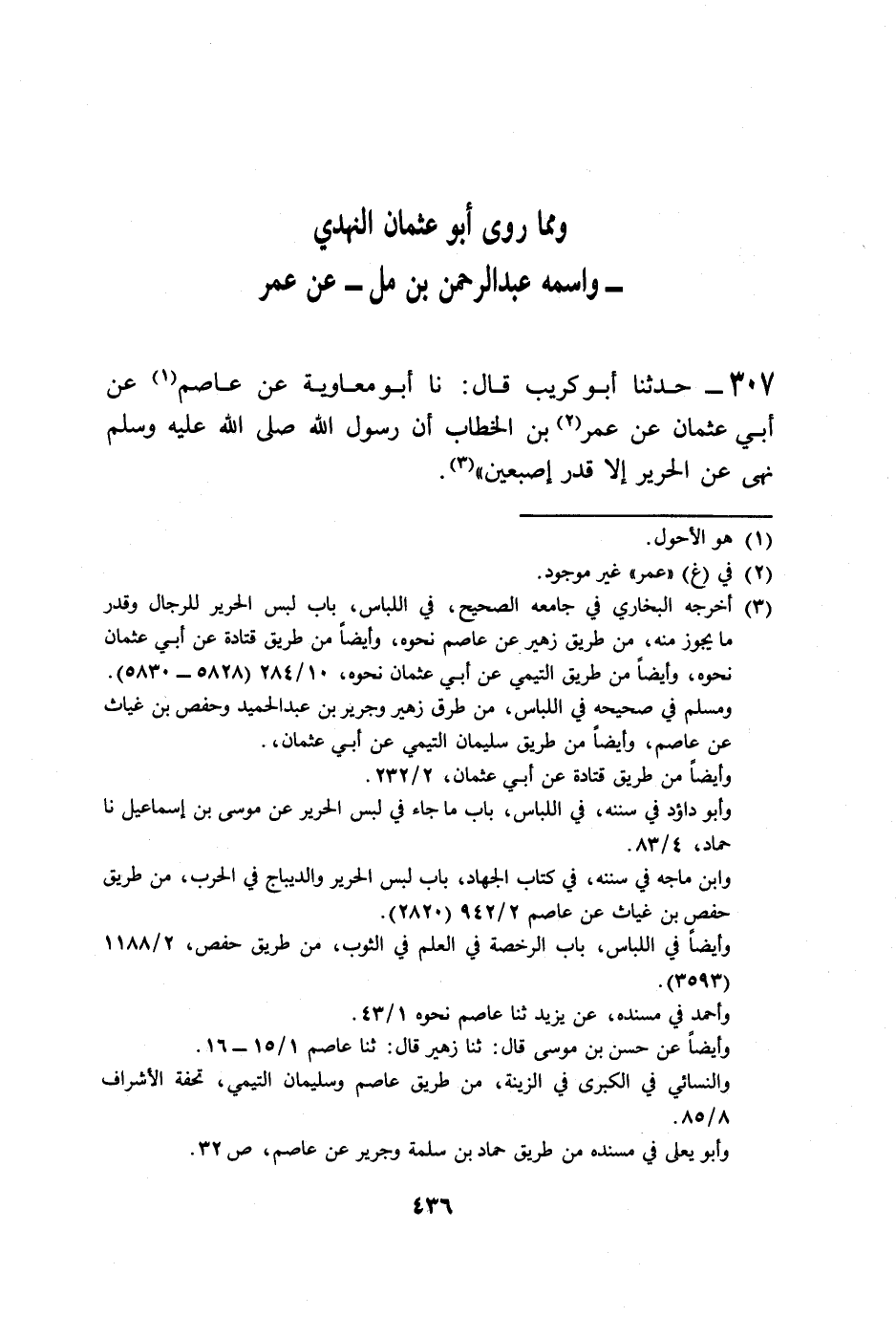 307 - حَدَّثَنَا أَبُو كُرَيْبٍ، قَالَ: نا أَبُو مُعَاوِيَةَ، عَنْ عَاصِمٍ، عَنْ أَبِي عُثْمَانَ، عَنْ عُمَرَ بْنِ الْخَطَّابِ: أَنَّ رَسُولَ اللَّهِ صَلَّى اللهُ عَلَيْهِ وَسَلَّمَ §نَهَى عَنِ الْحَرِيرِ إِلَّا قَدْرَ إِصْبَعَيْنِ " -[437]- وَهَذَا الْحَدِيثُ قَدْ رُوِيَ عَنْ عُمَرَ مِنْ غَيْرِ وَجْهٍ