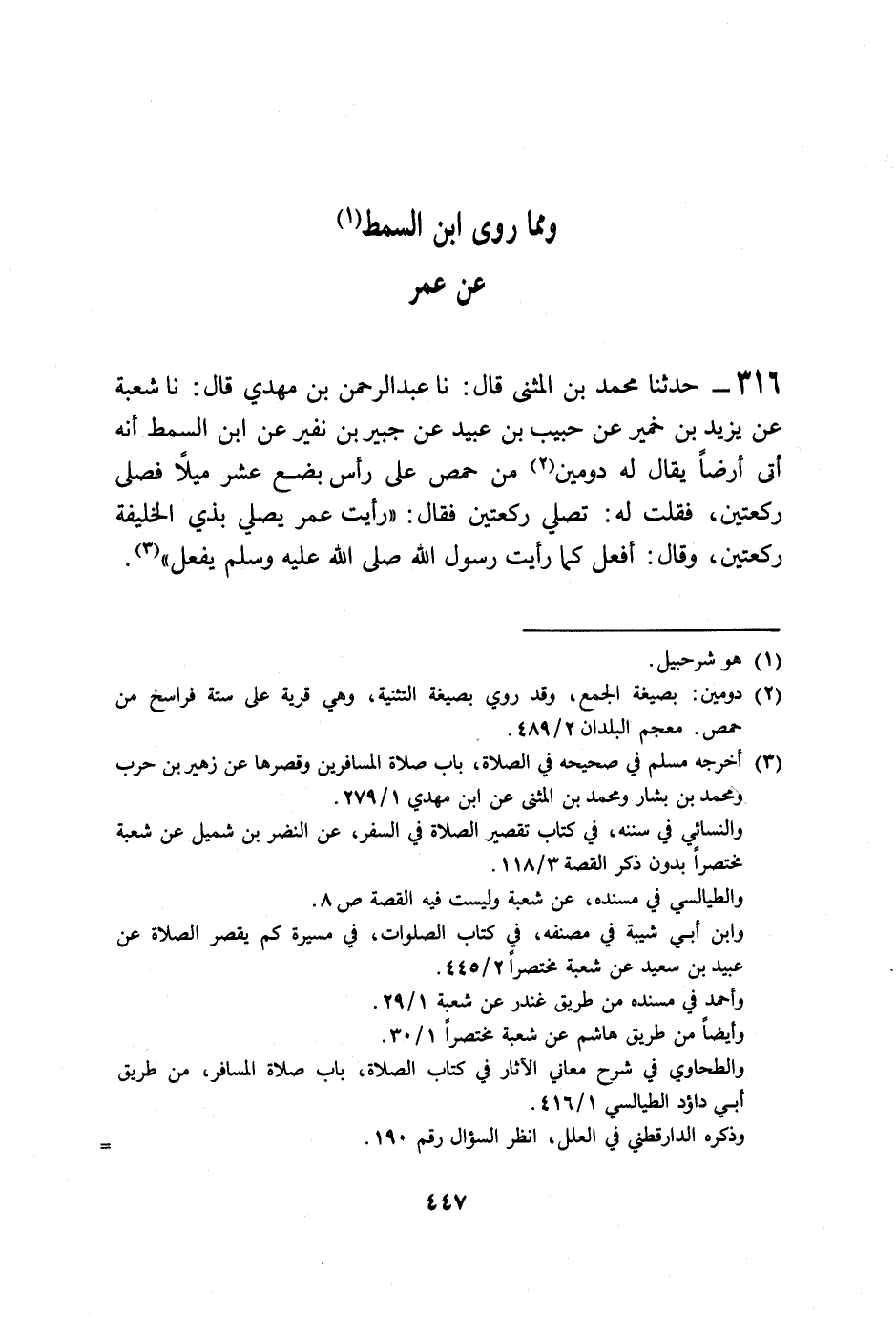 316 - حَدَّثَنَا مُحَمَّدُ بْنُ الْمُثَنَّى قَالَ: نا عَبْدُ الرَّحْمَنِ بْنُ مَهْدِيٍّ قَالَ: نا شُعْبَةُ، عَنْ يَزِيدَ بْنِ خُمَيْرٍ، عَنْ حَبِيبِ بْنِ عُبَيْدٍ، عَنْ جُبَيْرِ بْنِ نُفَيْرٍ، عَنِ ابْنِ السِّمْطِ: أَنَّهُ أَتَى أَرْضًا يُقَالُ لَهُ: دُومِينَ مِنْ حِمْصٍ عَلَى رَأْسِ بِضْعَةَ عَشَرَ مِيلًا فَصَلَّى رَكْعَتَيْنِ، فَقُلْتُ لَهُ: تُصَلِّي رَكْعَتَيْنِ؟ فَقَالَ: رَأَيْتُ §عُمَرَ يُصَلِّي بِذِي الْحُلَيْفَةِ رَكْعَتَيْنِ، وَقَالَ: أَفْعَلُ كَمَا رَأَيْتُ رَسُولَ اللَّهِ صَلَّى اللهُ عَلَيْهِ وَسَلَّمَ يَفْعَلُ " -[448]- وَهَذَا الْحَدِيثُ لَا نَعْلَمُهُ يُرْوَى عَنْ عُمَرَ إِلَّا مِنْ هَذَا الْوَجْهِ بِهَذَا الْإِسْنَادِ، وَيُرْوَى عَنِ النَّبِيِّ صَلَّى اللهُ عَلَيْهِ وَسَلَّمَ أَنَّهُ قَالَ: «الْبِضْعُ مَا بَيْنَ الثَّلَاثِ إِلَى التِّسْعِ»