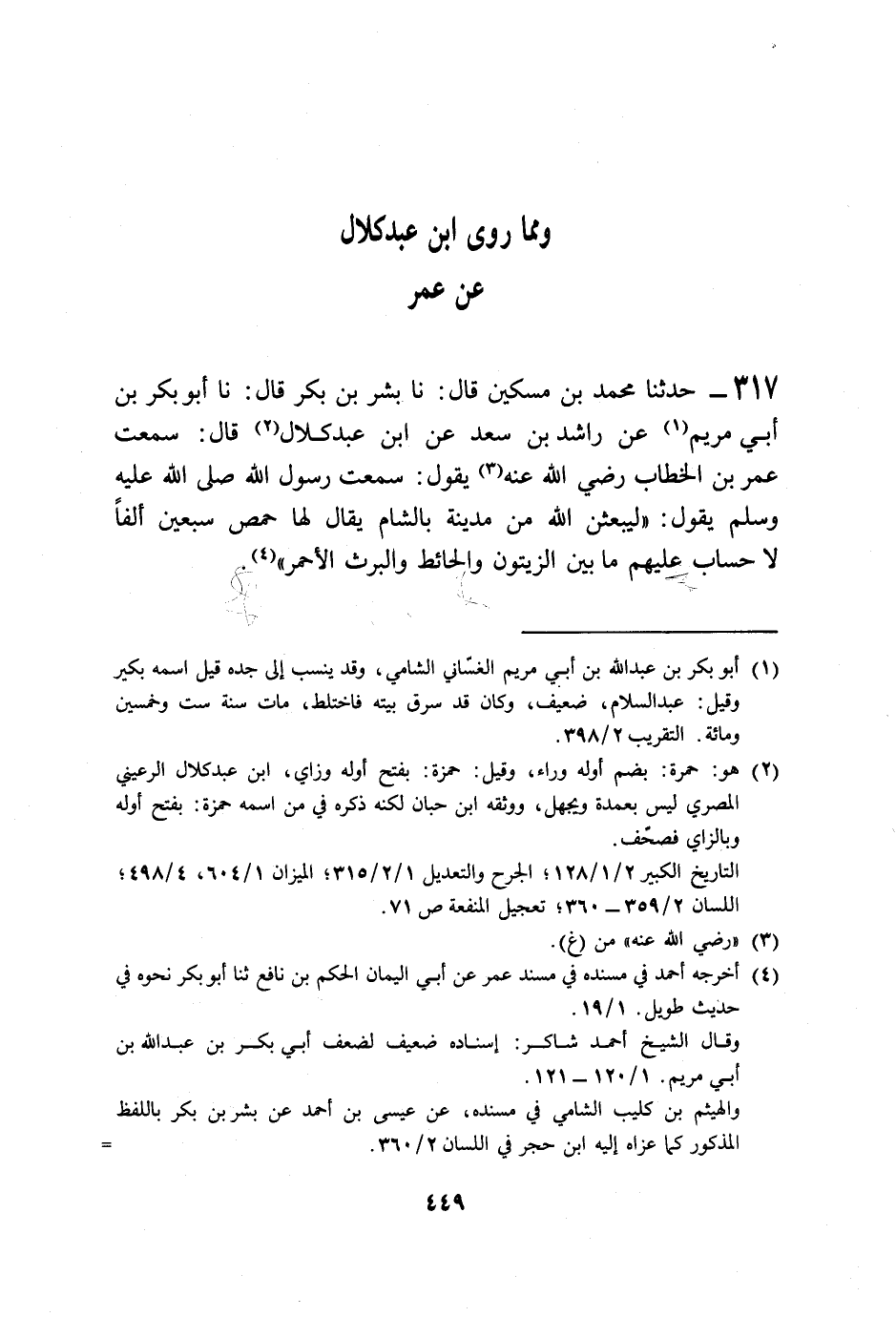 317 - حَدَّثَنَا مُحَمَّدُ بْنُ مِسْكِينٍ قَالَ: نا بِشْرُ بْنُ بَكْرٍ قَالَ: نا أَبُو بَكْرِ بْنُ أَبِي مَرْيَمَ، عَنْ رَاشِدِ بْنِ سَعْدٍ، عَنِ ابْنِ عَبْدِ كُلَالٍ، قَالَ: سَمِعْتُ عُمَرَ بْنَ الْخَطَّابِ رَضِيَ اللَّهُ عَنْهُ يَقُولُ: سَمِعْتُ رَسُولَ اللَّهِ صَلَّى اللهُ عَلَيْهِ وَسَلَّمَ يَقُولُ: " §لَيَبْعَثَنَّ اللَّهُ مِنْ مَدِينَةٍ بِالشَّامِ يُقَالُ لَهَا: حِمْصٌ سَبْعِينَ أَلْفًا لَا حِسَابَ عَلَيْهِمْ، مَا بَيْنَ الزَّيْتُونِ، وَالْحَائِطِ، وَالْبَرَثِ الْأَحْمَرِ " -[450]- وَهَذَا الْحَدِيثُ لَا نَعْلَمُهُ يُرْوَى عَنِ النَّبِيِّ صَلَّى اللهُ عَلَيْهِ وَسَلَّمَ إِلَّا مِنْ هَذَا الْوَجْهِ بِهَذَا الْإِسْنَادِ، وَابْنُ عَبْدِ كُلَالٍ فَلَيْسَ بِمَعْرُوفٍ بِالنَّقْلِ