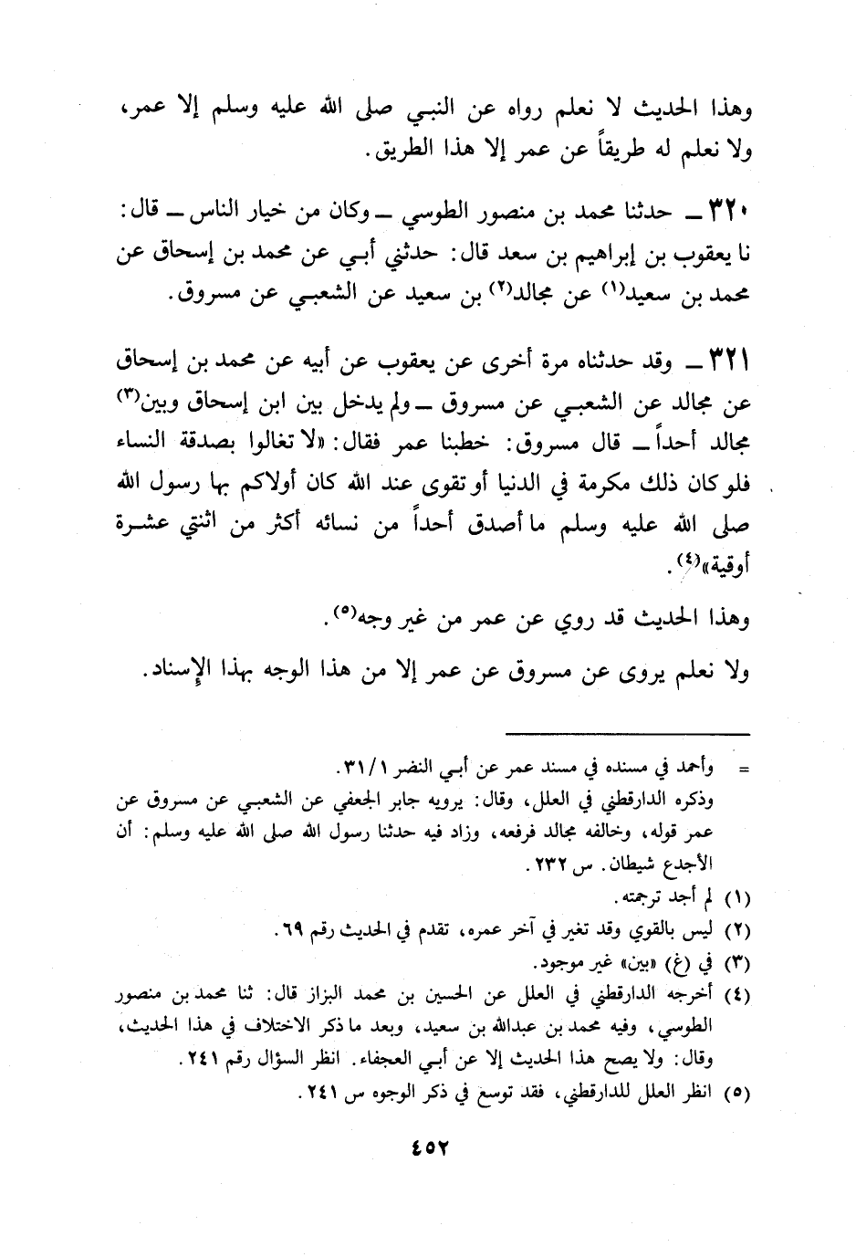 321 - وَقَدْ حَدَّثَنَاهُ مَرَّةً أُخْرَى عَنْ يَعْقُوبَ، عَنْ أَبِيهِ، عَنْ مُحَمَّدِ بْنِ إِسْحَاقَ، عَنْ مُجَالِدٍ، عَنِ الشَّعْبِيِّ، عَنْ مَسْرُوقٍ - وَلَمْ يَدْخُلْ بَيْنَ ابْنِ إِسْحَاقَ وَبَيْنَ مُجَالِدٍ أَحَدًا - قَالَ مَسْرُوقٌ: خَطَبَنَا عُمَرُ فَقَالَ: «§لَا تُغَالُوا بِصَدَقَةِ النِّسَاءِ، فَلَوْ كَانَ ذَلِكَ مَكْرُمَةً فِي الدُّنْيَا أَوْ تَقْوَى عِنْدَ اللَّهَ كَانَ أَوْلَاكُمْ بِهَا رَسُولُ اللَّهِ صَلَّى اللهُ عَلَيْهِ وَسَلَّمَ، مَا أَصْدَقَ أَحَدًا مِنْ نِسَائِهِ أَكْثَرَ مِنَ اثْنَتَيْ عَشْرَةَ أُوقِيَّةً» وَهَذَا الْحَدِيثُ قَدْ رُوِيَ عَنْ عُمَرَ، مِنْ غَيْرِ وَجْهٍ وَلَا نَعْلَمُ يُرْوَى عَنْ مَسْرُوقٍ، عَنْ عُمَرَ إِلَّا مِنْ هَذَا الْوَجْهِ بِهَذَا الْإِسْنَادِ