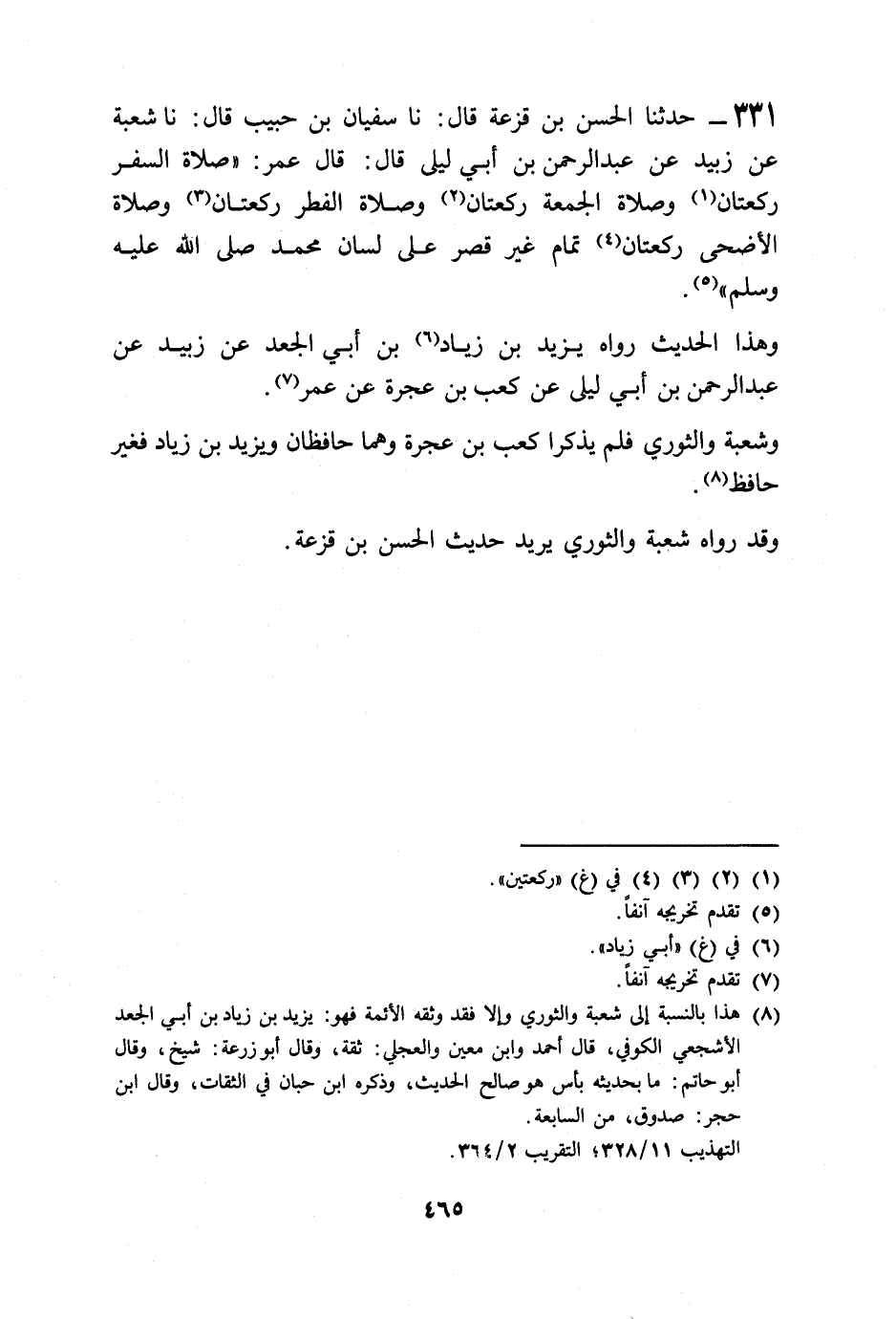 331 - حَدَّثَنَا الْحَسَنُ بْنُ قَزَعَةَ قَالَ: نا سُفْيَانُ بْنُ حَبِيبٍ قَالَ: نا شُعْبَةُ، عَنْ زُبَيْدٍ، عَنْ عَبْدِ الرَّحْمَنِ بْنِ أَبِي لَيْلَى قَالَ: قَالَ عُمَرُ: «§صَلَاةُ السَّفَرِ رَكْعَتَانِ، وَصَلَاةُ الْجُمُعَةِ رَكْعَتَانِ، وَصَلَاةُ الْفِطْرِ رَكْعَتَانِ، وَصَلَاةُ الْأَضْحَى رَكْعَتَانِ تَمَامٌ غَيْرُ قَصْرٍ عَلَى لِسَانِ مُحَمَّدٍ صَلَّى اللهُ عَلَيْهِ وَسَلَّمَ» وَهَذَا الْحَدِيثُ رَوَاهُ يَزِيدُ بْنُ زِيَادِ بْنِ أَبِي الْجَعْدِ، عَنْ زُبَيْدٍ، عَنْ عَبْدِ الرَّحْمَنِ بْنِ أَبِي لَيْلَى، عَنْ كَعْبِ بْنِ عُجْرَةَ، عَنْ عُمَرَ، وَشُعْبَةَ، وَالثَّوْرِيَّ فَلَمْ يَذْكُرَا كَعْبَ بْنَ عُجْرَةَ، وَهُمَا حَافِظَانِ، وَيَزِيدُ بْنُ زِيَادٍ فَغَيْرُ حَافَظٍ، وَقَدْ رَوَاهُ شُعْبَةُ وَالثَّوْرِيُّ , يُرِيدُ: حَدِيثَ الْحَسَنِ بْنِ قَزَعَةَ
