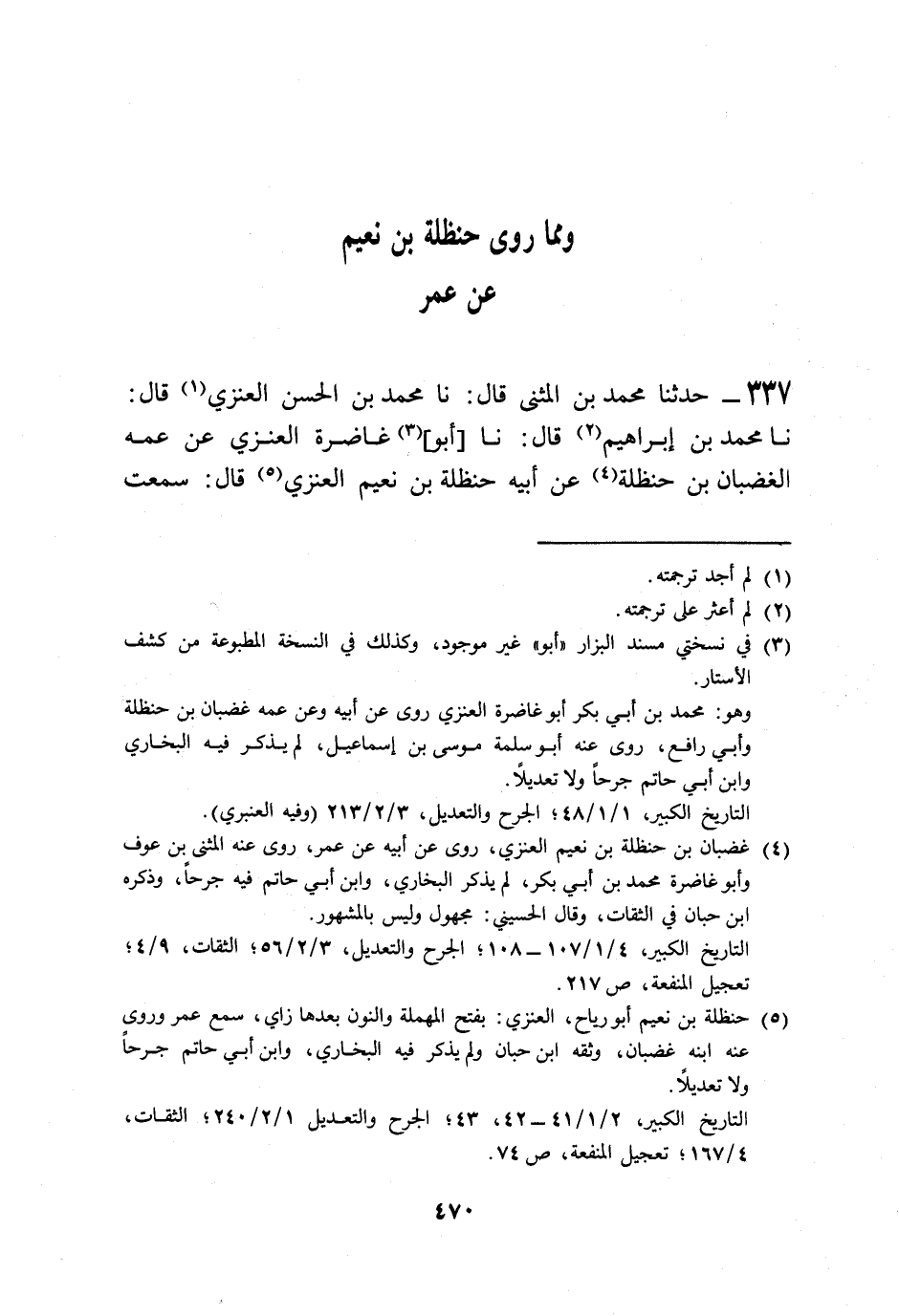 337 - حَدَّثَنَا مُحَمَّدُ بْنُ الْمُثَنَّى قَالَ: نا مُحَمَّدُ بْنُ الْحَسَنِ الْعَنَزِيُّ قَالَ: نا مُحَمَّدُ بْنُ إِبْرَاهِيمَ قَالَ: نا أَبُو غَاضِرَةَ الْعَنَزِيُّ، عَنْ عَمِّهِ الْغَضْبَانَ بْنِ حَنْظَلَةَ، عَنْ أَبِيهِ حَنْظَلَةَ بْنِ نُعَيْمٍ الْعَنَزِيِّ قَالَ: سَمِعْتُ -[471]- عُمَرَ بْنَ الْخَطَّابِ وَذَكَرَ عَنَزَةَ فَقَالَ: سَمِعْتُ رَسُولَ اللَّهِ صَلَّى اللهُ عَلَيْهِ وَسَلَّمَ يَقُولُ: «§لَحَيٌّ مَبْغِيٌّ عَلَيْهِمْ مَنْصُورُونَ» وَهَذَا الْحَدِيثُ لَا نَعْلَمُهُ يُرْوَى عَنِ النَّبِيِّ صَلَّى اللهُ عَلَيْهِ وَسَلَّمَ إِلَّا عَنْ عُمَرَ، وَلَا نَعْلَمُ لَهُ طَرِيقًا عَنْ عُمَرَ إِلَّا هَذَا الطَّرِيقَ