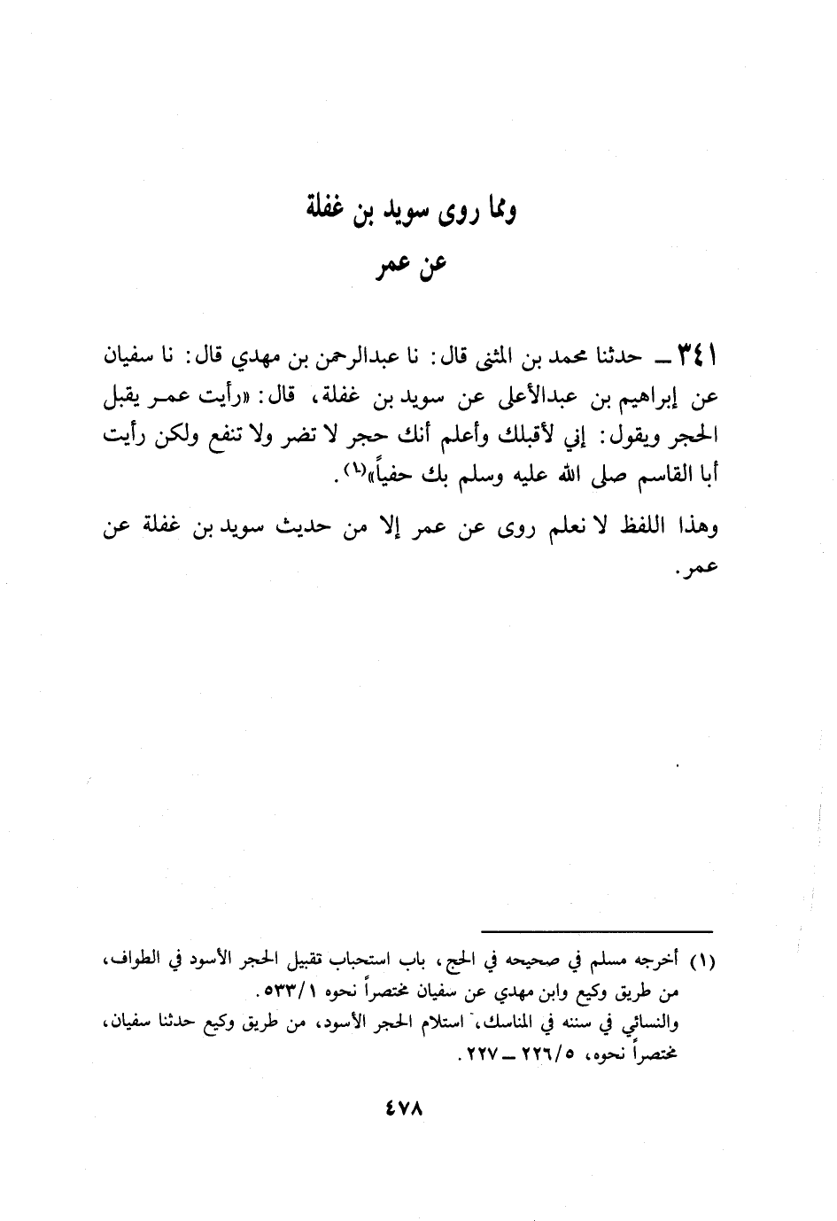 341 - حَدَّثَنَا مُحَمَّدُ بْنُ الْمُثَنَّى قَالَ: نا عَبْدُ الرَّحْمَنِ بْنُ مَهْدِيٍّ قَالَ: نا سُفْيَانُ، عَنْ إِبْرَاهِيمَ بْنِ عَبْدِ الْأَعْلَى، عَنْ سُوَيْدِ بْنِ غَفَلَةَ قَالَ: رَأَيْتُ عُمَرَ يُقَبِّلُ الْحَجَرَ وَيَقُولُ: «§إِنِّي لَأُقَبِّلُكَ وَأَعْلَمُ أَنَّكَ حَجَرٌ لَا تَضُرُّ وَلَا تَنْفَعُ، وَلَكِنْ رَأَيْتُ أَبَا الْقَاسِمِ صَلَّى اللهُ عَلَيْهِ وَسَلَّمَ بِكَ حَفِيًّا» وَهَذَا اللَّفْظُ لَا نَعْلَمُ رُوِيَ عَنْ عُمَرَ إِلَّا مِنْ حَدِيثِ سُوَيْدِ بْنِ غَفَلَةَ، عَنْ عُمَرَ