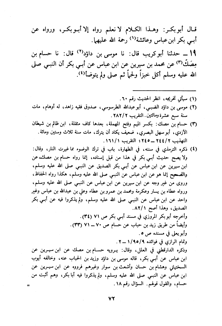 19 - حَدَّثَنَا أَبُو كُرَيْبٍ قَالَ: نا مُوسَى بْنُ دَاوُدَ قَالَ: نا حُسَامُ بْنُ مِصَكٍّ، عَنْ مُحَمَّدِ بْنِ سِيرِينَ، عَنِ ابْنِ عَبَّاسٍ، عَنْ أَبِي بَكْرٍ «أَنَّ النَّبِيَّ صَلَّى اللهُ عَلَيْهِ وَسَلَّمَ §أَكَلَ خُبْزًا وَلَحْمًا ثُمَّ صَلَّى وَلَمْ يَتَوَضَّأْ» -[73]- قَالَ أَبُو بَكْرٍ: وَهَذَا الْحَدِيثُ قَدْ رَوَاهُ هِشَامُ بْنُ حَسَّانَ وَأَشْعَثُ بْنُ عَبْدِ الْمَلِكِ وَغَيْرُهُمَا، عَنْ مُحَمَّدِ بْنِ سِيرِينَ، عَنِ ابْنِ عَبَّاسٍ، عَنِ النَّبِيِّ صَلَّى اللهُ عَلَيْهِ وَسَلَّمَ وَلَمْ يَقُولُوا: عَنْ أَبِي بَكْرٍ وَإِنَّمَا قَالَهُ حُسَامٌ، عَنِ ابْنِ عَبَّاسٍ، عَنْ أَبِي بَكْرٍ، وَحُسَامٌ فَلَيْسَ بِالْقَوِيِّ عَلَى أَنَّ مُحَمَّدَ بْنَ سِيرِينَ لَمْ يَسْمَعْ مِنِ ابْنِ عَبَّاسٍ