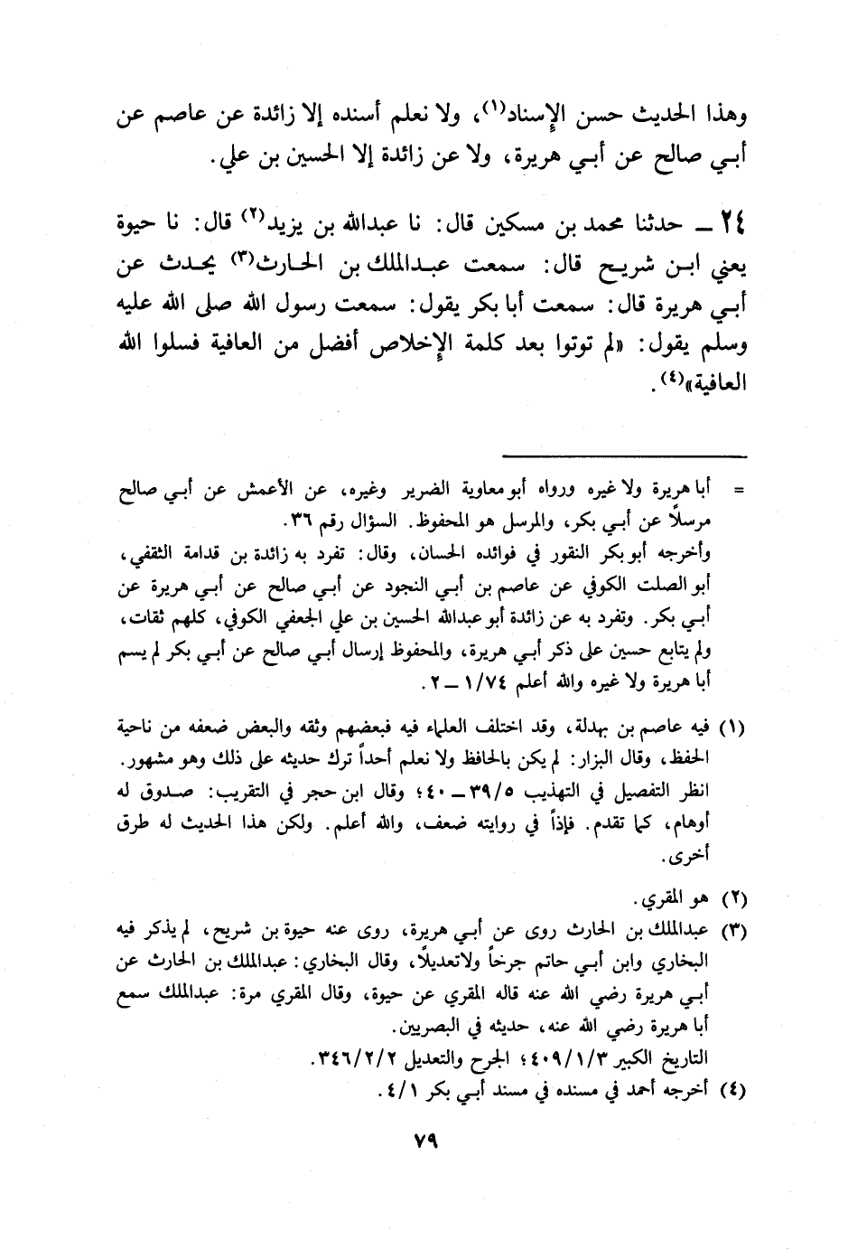 24 - حَدَّثَنَا مُحَمَّدُ بْنُ مِسْكِينٍ قَالَ: نا عَبْدُ اللَّهِ بْنُ يَزِيدَ قَالَ: نا حَيْوَةُ يَعْنِي ابْنَ شُرَيْحٍ قَالَ: سَمِعْتُ عَبْدَ الْمَلِكِ بْنَ الْحَارِثِ، يُحَدِّثُ عَنْ أَبِي هُرَيْرَةَ قَالَ: سَمِعْتُ أَبَا بَكْرٍ يَقُولُ: سَمِعْتُ رَسُولَ اللَّهِ صَلَّى اللَّهِ عَلَيْهِ وَسَلَّمَ يَقُولُ: «§لَمْ تُؤْتَوْا بَعْدَ كَلِمَةِ الْإِخْلَاصِ أَفْضَلَ مِنَ الْعَافِيَةِ، فَسَلُوا اللَّهَ الْعَافِيَةَ» -[80]- وَعَبْدُ الْمَلِكِ بْنُ الْحَارِثِ لَا نَعْلَمُ رَوَى عَنْهُ غَيْرُ حَيْوَةَ