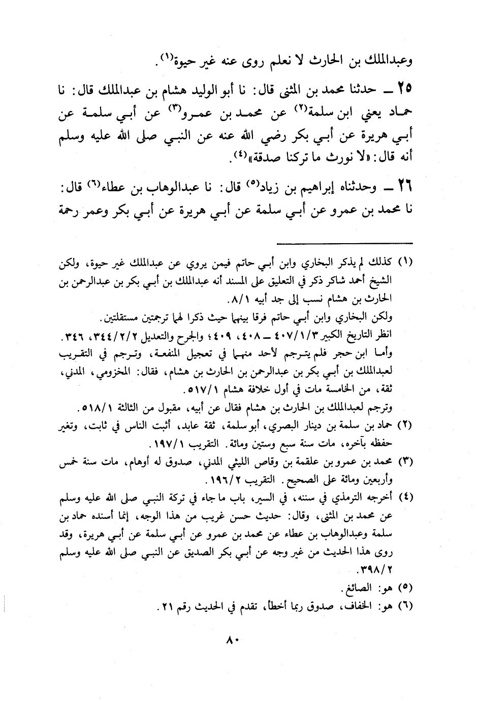 25 - حَدَّثَنَا مُحَمَّدُ بْنُ الْمُثَنَّى قَالَ: نا أَبُو الْوَلِيدِ هِشَامُ بْنُ عَبْدِ الْمَلِكِ قَالَ: نا حَمَّادٌ يَعْنِي ابْنَ سَلَمَةَ، عَنْ مُحَمَّدِ بْنِ عَمْرٍو، عَنْ أَبِي سَلَمَةَ، عَنْ أَبِي هُرَيْرَةَ، عَنْ أَبِي بَكْرٍ رَضِيَ اللَّهُ عَنْهُ، عَنِ النَّبِيِّ صَلَّى اللهُ عَلَيْهِ وَسَلَّمَ أَنَّهُ قَالَ: «§لَا نُورَثُ، مَا تَرَكْنَا صَدَقَةٌ»