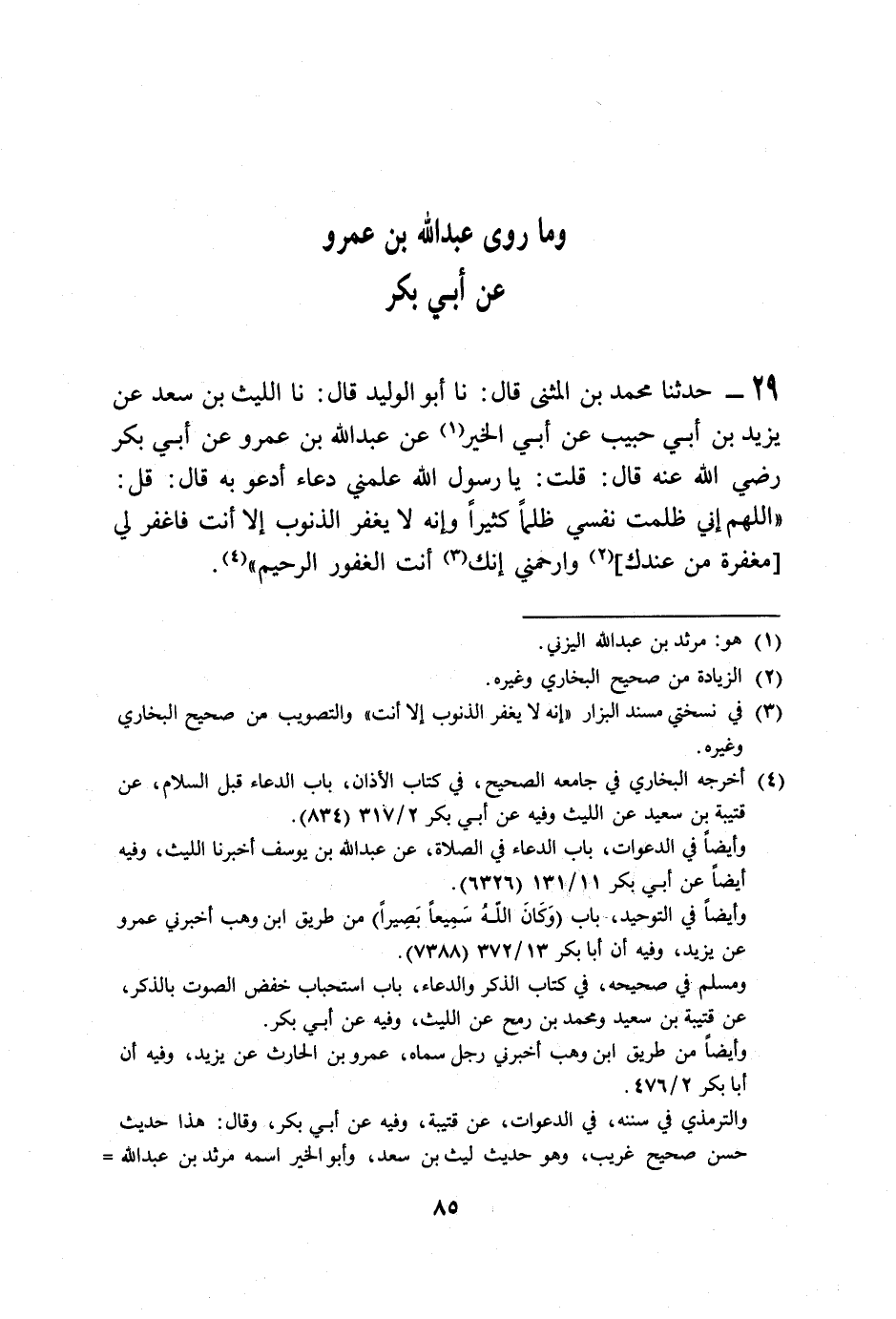 29 - حَدَّثَنَا مُحَمَّدُ بْنُ الْمُثَنَّى قَالَ: نا أَبُو الْوَلِيدِ، قَالَ: نا اللَّيْثُ بْنُ سَعْدٍ، عَنْ يَزِيدَ بْنِ أَبِي حَبِيبٍ، عَنْ أَبِي الْخَيْرِ، عَنْ عَبْدِ اللَّهِ بْنِ عَمْرٍو، عَنْ أَبِي بَكْرٍ رَضِيَ اللَّهُ عَنْهُ قَالَ: قُلْتُ يَا رَسُولَ اللَّهِ: عَلِّمْنِي دُعَاءً أَدْعُو بِهِ قَالَ: " قُلِ: §اللَّهُمَّ إِنِّي ظَلَمْتُ نَفْسِي ظُلْمًا كَثِيرًا وَإِنَّهُ لَا يَغْفِرُ الذُّنُوبَ إِلَّا أَنْتَ فَاغْفِرْ لِي مَغْفِرَةً مِنْ عِنْدِكَ وَارْحَمْنِي، إِنَّكَ أَنْتَ الْغَفُورُ الرَّحِيمُ " -[86]- وَهَذَا الْحَدِيثُ لَا نَعْلَمُهُ يُرْوَى عَنْ أَبِي بَكْرٍ، عَنِ النَّبِيِّ صَلَّى اللهُ عَلَيْهِ وَسَلَّمَ إِلَّا بِهَذَا الْإِسْنَادِ وَقَدْ رَوَاهُ بَعْضُ أَصْحَابِ اللَّيْثِ عَنِ اللَّيْثِ بِهَذَا الْإِسْنَادِ، عَنْ عَبْدِ اللَّهِ بْنِ عَمْرٍو: أَنَّ أَبَا بَكْرٍ قَالَ: يَا رَسُولَ اللَّهِ، وَبَعْضُهُمْ قَالَ: عَنْ أَبِي بَكْرٍ فَذَكَرْنَاهُ عَنْ أَبِي الْوَلِيدِ وَاجْتَزَيْنَا بِهِ؛ إِذْ كَانَ ثِقَةً وَقَدْ أَسْنَدَهُ