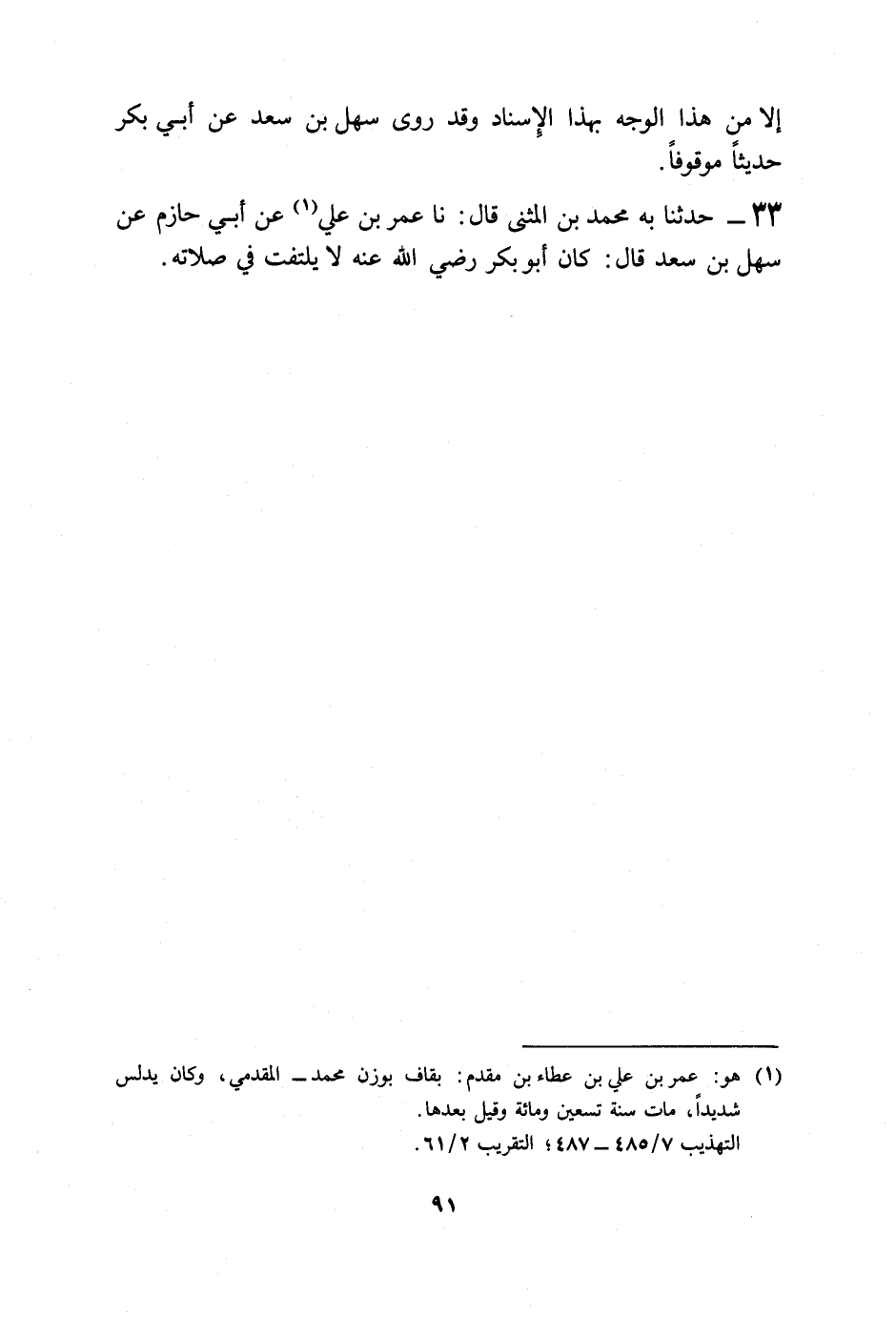 33 - حَدَّثَنَا بِهِ مُحَمَّدُ بْنُ الْمُثَنَّى قَالَ: نا عُمَرُ بْنُ عَلِيٍّ، عَنْ أَبِي حَازِمٍ، عَنْ سَهْلِ بْنِ سَعْدٍ قَالَ: كَانَ أَبُو بَكْرٍ رَضِيَ اللَّهُ عَنْهُ «§لَا يَلْتَفِتُ فِي صَلَاتِهِ»