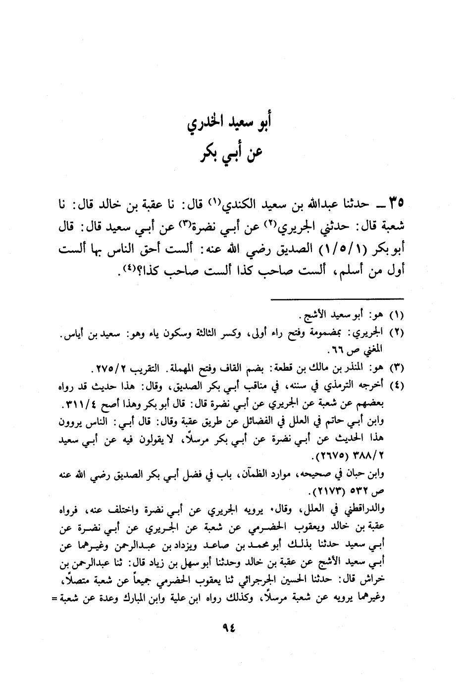35 - حَدَّثَنَا عَبْدُ اللَّهِ بْنُ سَعِيدٍ الْكِنْدِيُّ قَالَ: نا عُقْبَةُ بْنُ خَالِدٍ قَالَ: نا شُعْبَةُ قَالَ: حَدَّثَنِي الْجُرَيْرِيُّ، عَنْ أَبِي نَضْرَةَ، عَنْ أَبِي سَعِيدٍ، قَالَ: قَالَ أَبُو بَكْرٍ الصِّدِّيقُ رَضِيَ اللَّهُ عَنْهُ: «§أَلَسْتُ أَحَقَّ النَّاسِ بِهَا، أَلَسْتُ أَوَّلَ مَنْ أَسْلَمَ أَلَسْتُ صَاحِبَ كَذَا، أَلَسْتُ صَاحِبَ كَذَا» -[95]- وَهَذَا الْحَدِيثُ لَا نَعْلَمُ أَحَدًا قَالَ فِيهِ، عَنْ شُعْبَةَ، عَنِ الْجُرَيْرِيِّ، عَنْ أَبِي نَضْرَةَ، عَنْ أَبِي سَعِيدٍ، إِلَّا عُقْبَةُ بْنُ خَالِدٍ، وَقَدْ رَوَاهُ عَبْدُ الرَّحْمَنِ بْنُ مَهْدِيٍّ، عَنْ شُعْبَةَ، عَنِ الْجُرَيْرِيِّ، عَنْ أَبِي نَضْرَةَ قَالَ: خَطَبَ أَبُو بَكْرٍ، وَلَمْ يَذْكُرْ أَبَا سَعِيدٍ