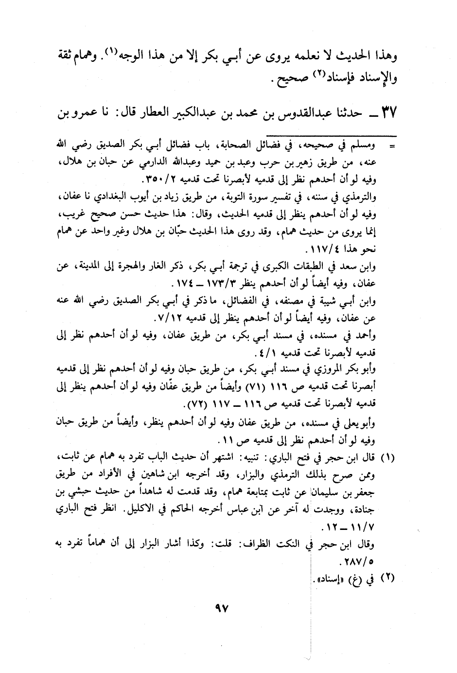 37 - حَدَّثَنَا عَبْدُ الْقُدُّوسِ بْنُ مُحَمَّدِ بْنِ عَبْدِ الْكَبِيرِ الْعَطَّارُ قَالَ: نا عَمْرُو بْنُ -[98]- عَاصِمٍ الْكِلَابِيُّ، قَالَ: نَا سُلَيْمَانُ بْنُ الْمُغِيرَةِ، عَنْ ثَابِتٍ، عَنْ أَنَسٍ، قَالَ: قَالَ أَبُو بَكْرٍ بَعْدَ وَفَاةِ رَسُولِ اللَّهِ صَلَّى اللهُ عَلَيْهِ وَسَلَّمَ: «انْطَلِقُوا بِنَا نَزُورُ §أُمَّ أَيْمَنَ كَمَا كَانَ رَسُولُ اللَّهِ صَلَّى اللهُ عَلَيْهِ وَسَلَّمَ يَزُورُهَا» وَهَذَا الْحَدِيثُ لَا نَعْلَمُ رَوَاهُ عَنْ سُلَيْمَانَ بْنِ الْمُغِيرَةِ إِلَّا عَمْرُو بْنُ عَاصِمٍ، وَلَا يُرْوَى عَنْ أَبِي بَكْرٍ إِلَّا مِنْ هَذَا الْوَجْهِ، وَالْإِسْنَادُ إِسْنَادٌ صَحِيحٌ