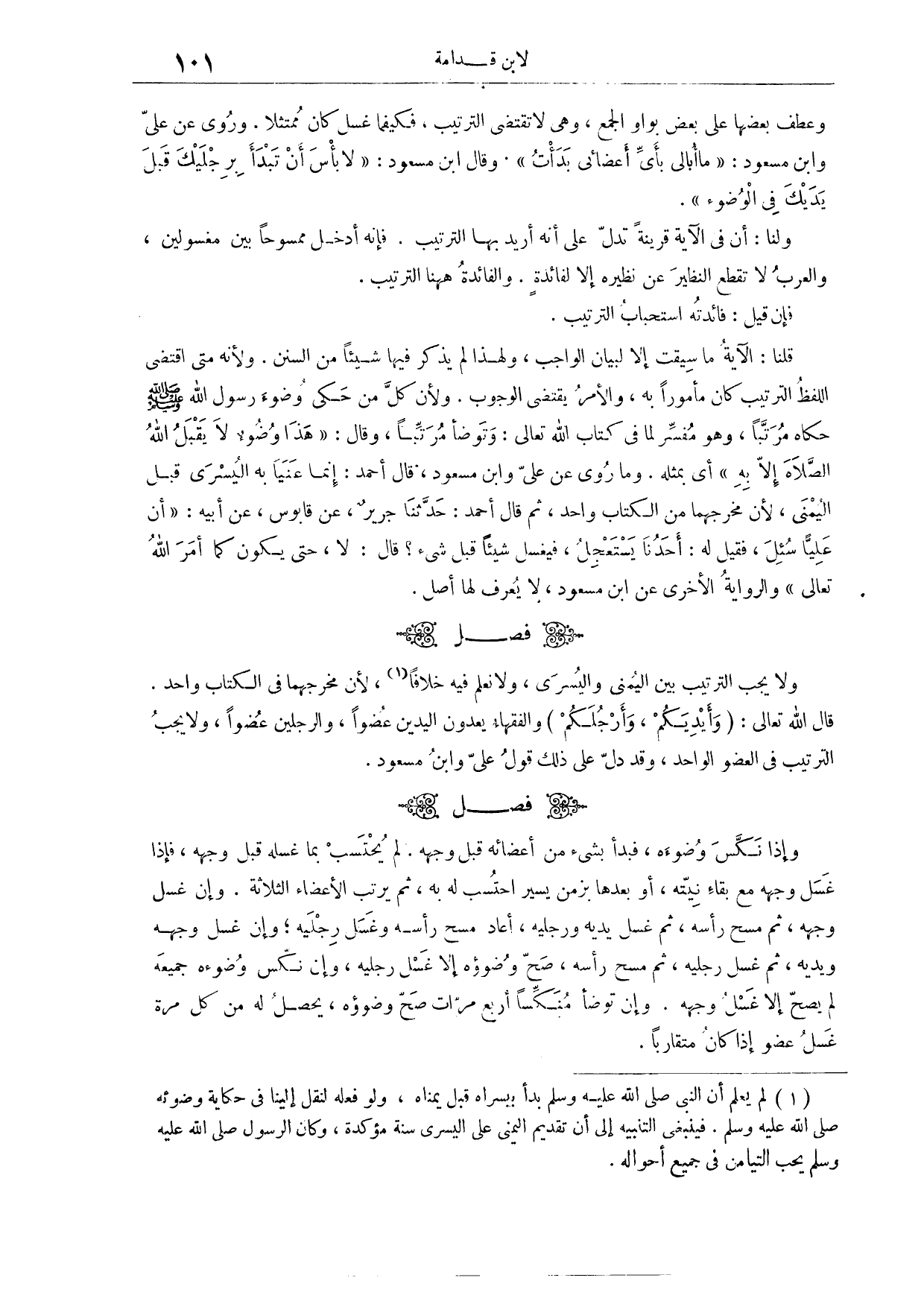 فَإِنْ قِيلَ: فَائِدَتُهُ اسْتِحْبَابُ التَّرْتِيبِ. قُلْنَا: الْآيَةُ مَا سِيقَتْ إلَّا لِبَيَانِ الْوَاجِبِ؛ وَلِهَذَا لَمْ يَذْكُرْ فِيهَا شَيْئًا مِنْ السُّنَنِ؛ وَلِأَنَّهُ مَتَى اقْتَضَى اللَّفْظُ التَّرْتِيبَ كَانَ مَأْمُورًا بِهِ، وَالْأَمْرُ يَقْتَضِي الْوُجُوبَ؛ وَلِأَنَّ كُلَّ مَنْ حَكَى وُضُوءَ رَسُولِ اللَّهِ - صَلَّى اللَّهُ عَلَيْهِ وَسَلَّمَ - حَكَاهُ مُرَتَّبًا، وَهُوَ مُفَسِّرٌ لِمَا فِي كِتَابِ اللَّهِ تَعَالَى، وَتَوَضَّأَ مُرَتِّبًا، وَقَالَ: «هَذَا وُضُوءٌ لَا يَقْبَلُ اللَّهُ الصَّلَاةَ إلَّا بِهِ» . أَيْ بِمِثْلِهِ، وَمَا رُوِيَ عَنْ عَلِيٍّ وَابْنِ مَسْعُودٍ قَالَ أَحْمَدُ: إنَّمَا عَنَيَا بِهِ الْيُسْرَى قَبْلَ الْيُمْنَى؛ لِأَنَّ مَخْرَجَهُمَا مِنْ الْكِتَابِ وَاحِدٌ.