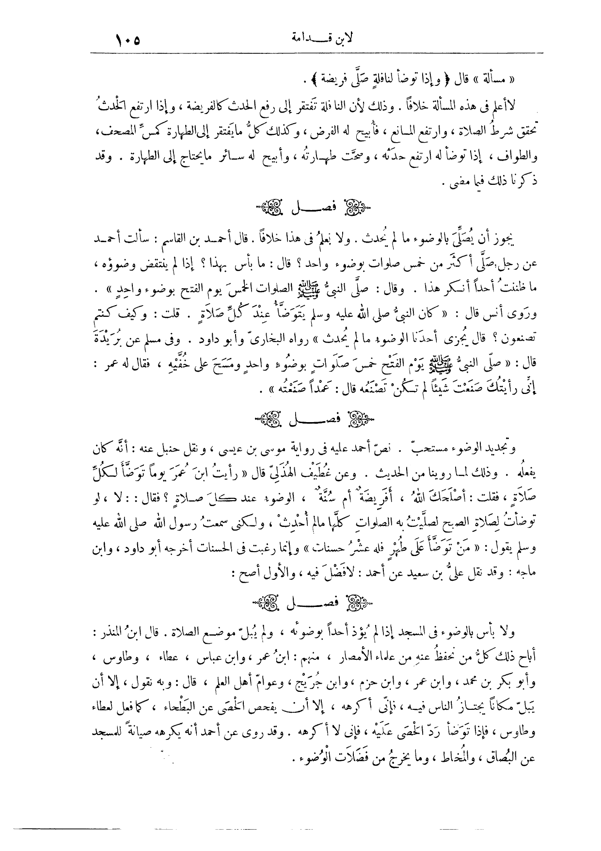 (١٩١) فَصْلٌ: وَتَجْدِيدُ الْوُضُوءِ مُسْتَحَبٌّ، نَصَّ أَحْمَدُ عَلَيْهِ فِي رِوَايَةِ مُوسَى بْنِ عِيسَى، وَنَقَلَ حَنْبَلُ عَنْهُ أَنَّهُ كَانَ يَفْعَلُهُ؛ وَذَلِكَ لِمَا رَوَيْنَا مِنْ الْحَدِيثِ، وَعَنْ غُطَيْفٍ الْهُذَلِيِّ، قَالَ: «رَأَيْت ابْنَ عُمَرَ يَوْمًا تَوَضَّأَ لِكُلِّ صَلَاةٍ، فَقُلْت: أَصْلَحَك اللَّهُ، أَفَرِيضَةٌ أَمْ سُنَّةٌ، الْوُضُوءُ عِنْدَ كُلِّ صَلَاةٍ؟ فَقَالَ: لَا، لَوْ تَوَضَّأْت لِصَلَاةِ الصُّبْحِ لَصَلَّيْت بِهِ الصَّلَوَاتِ كُلَّهَا مَا لَمْ أُحْدِثْ، وَلَكِنِّي سَمِعْت رَسُولَ اللَّهِ - صَلَّى اللَّهُ عَلَيْهِ وَسَلَّمَ - يَقُولُ: مَنْ تَوَضَّأَ عَلَى طُهْرٍ فَلَهُ عَشْرُ حَسَنَاتٍ. وَإِنَّمَا رَغِبْت فِي الْحَسَنَاتِ.» أَخْرَجَهُ أَبُو دَاوُد وَابْنُ مَاجَهْ. وَقَدْ نَقَلَ عَلِيُّ بْنُ سَعِيدٍ، عَنْ أَحْمَدَ: لَا فَضْلَ فِيهِ. وَالْأَوَّلُ أَصَحُّ.