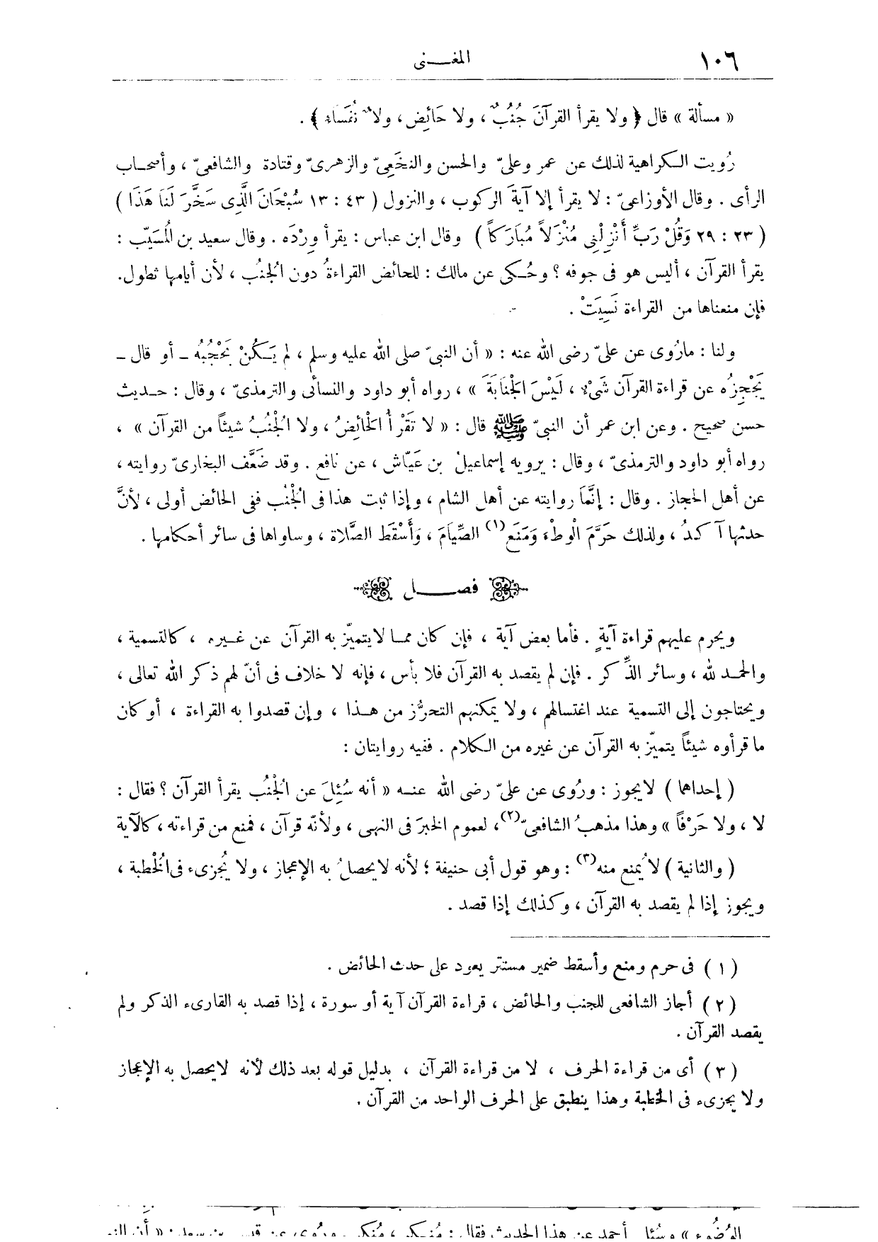 [مَسْأَلَة لَا يَقْرَأُ الْقُرْآنَ جُنُبٌ وَلَا حَائِضٌ وَلَا نُفَسَاءُ]