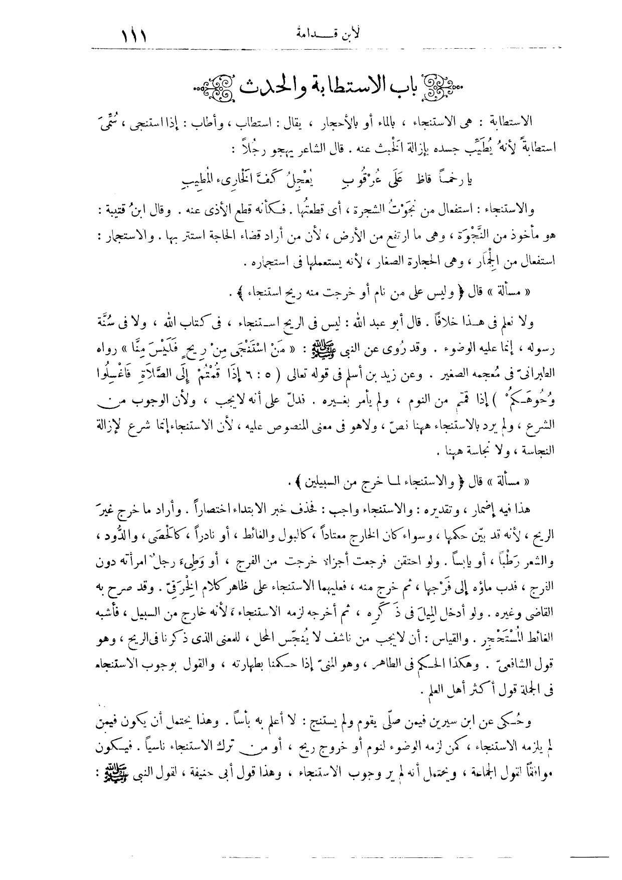(٢٠٤) مَسْأَلَةٌ: قَالَ: وَلَيْسَ عَلَى مَنْ نَامَ أَوْ خَرَجَتْ مِنْهُ رِيحٌ اسْتِنْجَاءٌ وَلَا نَعْلَمُ فِي هَذَا خِلَافًا. قَالَ أَبُو عَبْدِ اللَّهِ لَيْسَ فِي الرِّيحِ اسْتِنْجَاءٌ؛ فِي كِتَابِ اللَّهِ، وَلَا فِي سُنَّةِ رَسُولِهِ، إنَّمَا عَلَيْهِ الْوُضُوءُ، وَقَدْ رُوِيَ عَنْ النَّبِيِّ - صَلَّى اللَّهُ عَلَيْهِ وَسَلَّمَ - أَنَّهُ قَالَ: «مَنْ اسْتَنْجَى مِنْ رِيحٍ فَلَيْسَ مِنَّا.» رَوَاهُ الطَّبَرَانِيُّ فِي مُعْجَمِهِ الصَّغِيرِ، وَعَنْ زَيْدِ بْنِ أَسْلَمَ فِي قَوْله تَعَالَى: {إِذَا قُمْتُمْ إِلَى الصَّلاةِ فَاغْسِلُوا وُجُوهَكُمْ} [المائدة: ٦] . إذَا قُمْتُمْ مِنْ النَّوْمِ، وَلَمْ يَأْمُرْ بِغَيْرِهِ، فَدَلَّ عَلَى أَنَّهُ لَا يَجِبُ؛ وَلِأَنَّ الْوُجُوبَ مِنْ الشَّرْعِ، وَلَمْ يَرِدْ بِالِاسْتِنْجَاءِ هُنَا نَصٌّ، وَلَا هُوَ فِي مَعْنَى الْمَنْصُوصِ عَلَيْهِ؛ لِأَنَّ الِاسْتِنْجَاءَ إنَّمَا شُرِعَ لِإِزَالَةِ النَّجَاسَةِ، وَلَا نَجَاسَةَ هَاهُنَا.