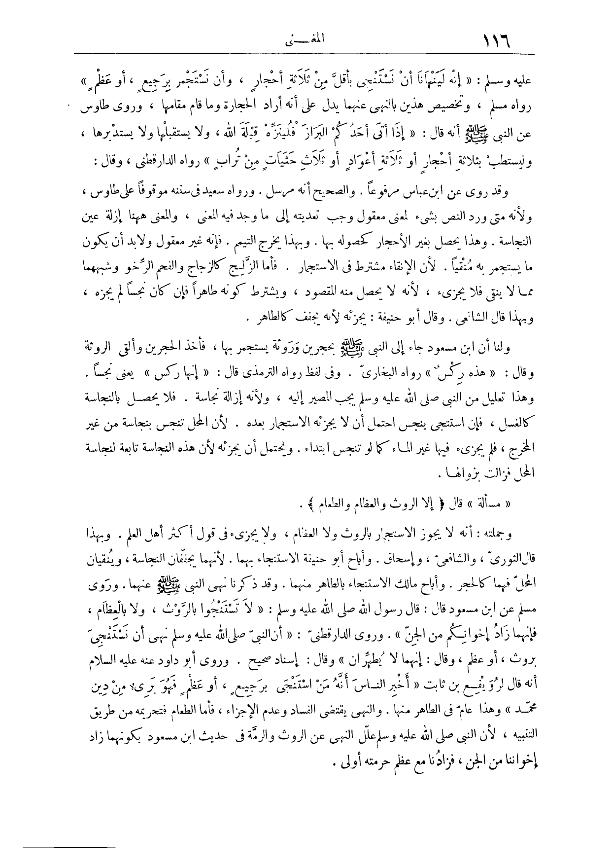 «إنَّهُ لَيَنْهَانَا أَنْ نَسْتَنْجِيَ بِأَقَلَّ مِنْ ثَلَاثَةِ أَحْجَارٍ، وَأَنْ نَسْتَجْمِرَ بِرَجِيعٍ أَوْ عَظْمٍ.» رَوَاهُ مُسْلِمٌ، وَتَخْصِيصُ هَذَيْنِ بِالنَّهْيِ عَنْهُمَا يَدُلُّ عَلَى أَنَّهُ أَرَادَ الْحِجَارَةَ، وَمَا قَامَ مَقَامَهَا. وَرَوَى طَاوُسٌ، عَنْ النَّبِيِّ - صَلَّى اللَّهُ عَلَيْهِ وَسَلَّمَ - أَنَّهُ قَالَ: «إذَا أَتَى أَحَدُكُمْ الْبَرَازَ فَلْيُنَزِّهْ قِبْلَةَ اللَّهِ، وَلَا يَسْتَقْبِلْهَا وَلَا يَسْتَدْبِرْهَا، وَلْيَسْتَطِبْ بِثَلَاثَةِ أَحْجَارٍ، أَوْ ثَلَاثَةِ أَعْوَادٍ، أَوْ ثَلَاثِ حَثَيَاتٍ مِنْ تُرَابٍ» . رَوَاهُ الدَّارَقُطْنِيّ، وَقَالَ: وَقَدْ رُوِيَ عَنْ ابْنِ عَبَّاسٍ مَرْفُوعًا، وَالصَّحِيحُ أَنَّهُ مُرْسَلٌ وَرَوَاهُ سَعِيدٌ فِي سُنَنِهِ مَوْقُوفًا عَلَى طَاوُسٍ.