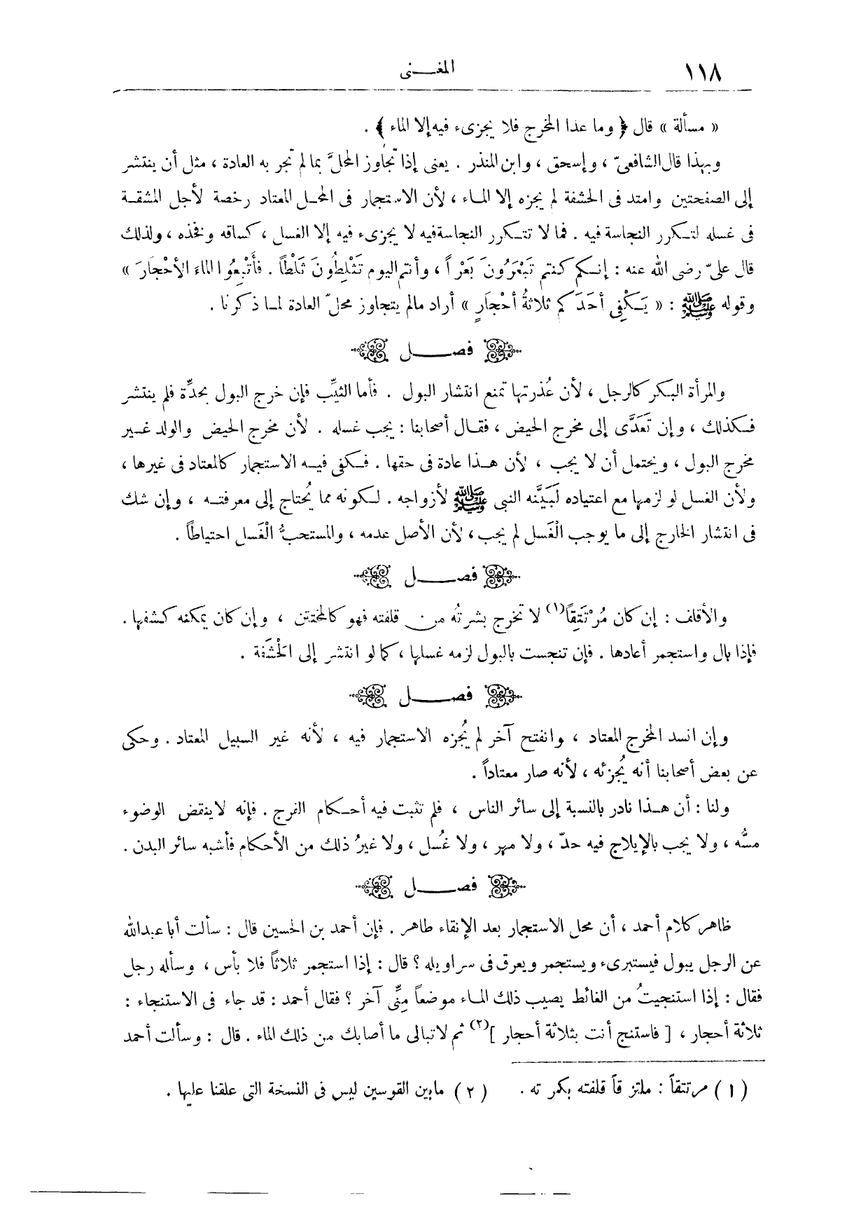 (٢٢٢) فَصْلٌ: ظَاهِرُ كَلَامِ أَحْمَدَ أَنَّ مَحَلَّ الِاسْتِجْمَارِ بَعْدَ الْإِنْقَاءِ طَاهِرٌ، فَإِنَّ أَحْمَدَ بْنَ الْحُسَيْنِ، قَالَ سَأَلْت أَبَا عَبْدِ اللَّهِ عَنْ الرَّجُلِ يَبُولُ فَيَسْتَبْرِئُ وَيَسْتَجْمِرُ يَعْرَقُ فِي سَرَاوِيلِهِ؟ قَالَ إذَا اسْتَجْمَرَ ثَلَاثًا فَلَا بَأْسَ. وَسَأَلَهُ رَجُلٌ، فَقَالَ إذَا اسْتَنْجَيْت مِنْ الْغَائِطِ يُصِيبُ ذَلِكَ الْمَاءُ مَوْضِعًا مِنِّي آخَرَ؟ فَقَالَ أَحْمَدُ: قَدْ جَاءَ فِي الِاسْتِنْجَاءِ ثَلَاثَةُ أَحْجَارٍ، فَاسْتَنْجِ أَنْتَ بِثَلَاثَةِ أَحْجَارٍ ثُمَّ لَا تُبَالِي مَا أَصَابَك مِنْ ذَلِكَ الْمَاءِ.
