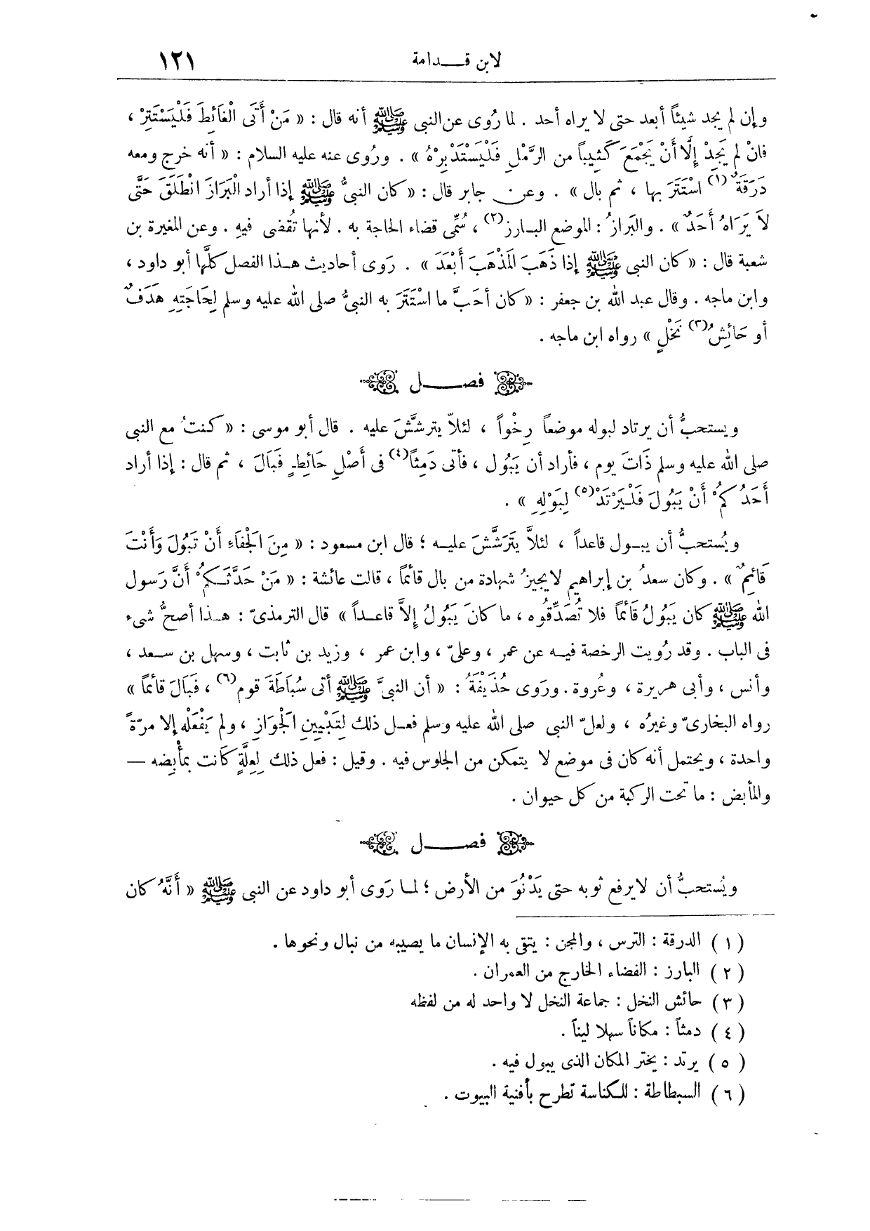 وَعَنْ جَابِرٍ قَالَ: «كَانَ النَّبِيُّ - صَلَّى اللَّهُ عَلَيْهِ وَسَلَّمَ - إذَا أَرَادَ الْبَرَازَ انْطَلَقَ حَتَّى لَا يَرَاهُ أَحَدٌ.» وَالْبَرَازُ: الْمَوْضِعُ الْبَارِزُ، سُمِّيَ قَضَاءُ الْحَاجَةِ بِهِ؛ لِأَنَّهَا تُقْضَى فِيهِ. وَعَنْ الْمُغِيرَةِ بْنِ شُعْبَةَ، قَالَ: «كَانَ النَّبِيُّ - صَلَّى اللَّهُ عَلَيْهِ وَسَلَّمَ - إذَا ذَهَبَ أَبْعَدَ» ، رَوَى أَحَادِيثَ هَذَا الْفَصْلِ كُلَّهَا أَبُو دَاوُد وَابْنُ مَاجَهْ. وَقَالَ عَبْدُ اللَّهِ بْنُ جَعْفَرٍ: «كَانَ أَحَبَّ مَا اسْتَتَرَ بِهِ النَّبِيُّ - صَلَّى اللَّهُ عَلَيْهِ وَسَلَّمَ - إلَيْهِ لِحَاجَتِهِ هَدَفٌ أَوْ حَائِشُ نَخْلٍ» رَوَاهُ ابْنُ مَاجَهْ.