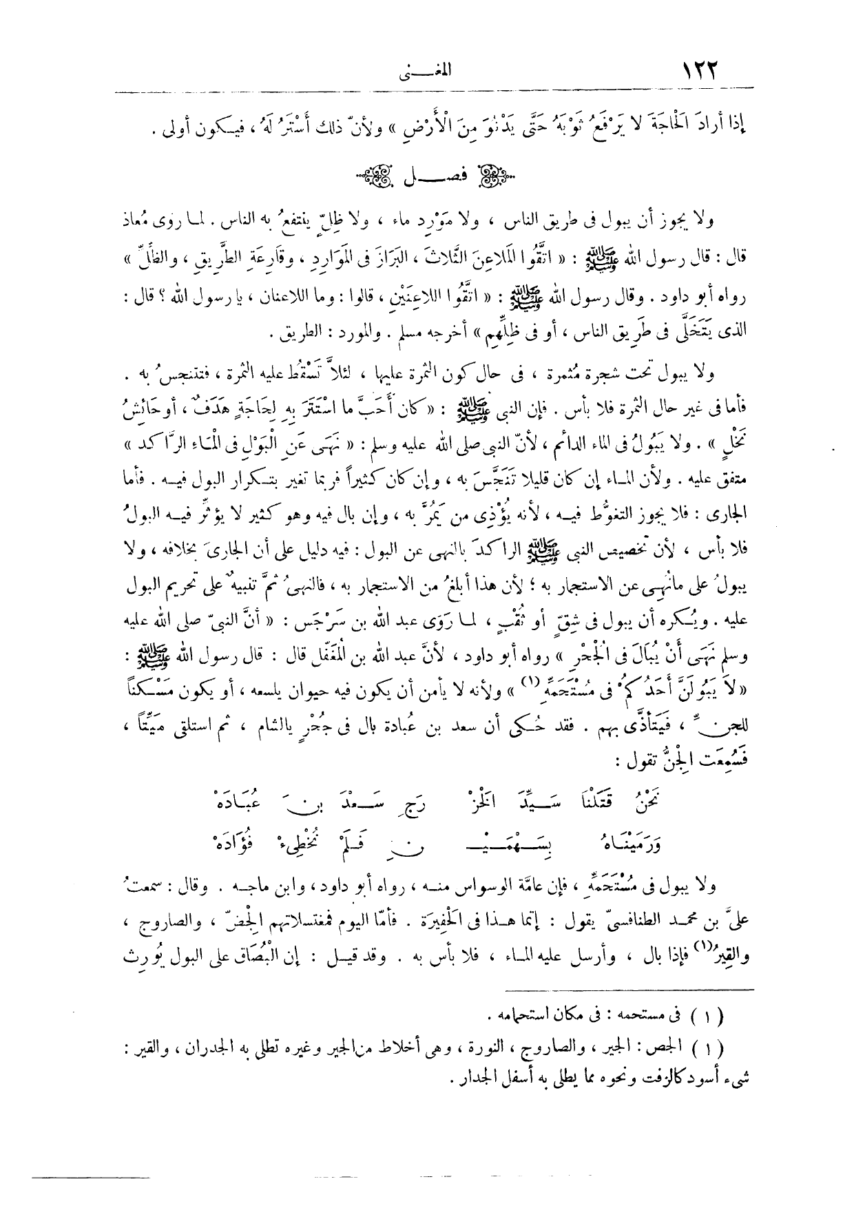 (٢٢٩) فَصْلٌ: وَلَا يَجُوزُ أَنْ يَبُولَ فِي طَرِيقِ النَّاسِ، وَلَا مَوْرِدِ مَاءٍ، وَلَا ظِلٍّ يَنْتَفِعُ بِهِ النَّاسُ؛ لِمَا رَوَى مُعَاذٌ، قَالَ: قَالَ رَسُولُ اللَّهِ - صَلَّى اللَّهُ عَلَيْهِ وَسَلَّمَ -: «اتَّقُوا الْمَلَاعِنَ الثَّلَاثَةَ - الْبَرَازَ فِي الْمَوَارِدِ، وَقَارِعَةِ الطَّرِيقِ، وَالظِّلِّ» رَوَاهُ أَبُو دَاوُد، وَقَالَ رَسُولُ اللَّهِ - صَلَّى اللَّهُ عَلَيْهِ وَسَلَّمَ -: " اتَّقُوا اللَّعَّانَيْنِ. قَالُوا: وَمَا اللَّعَّانَانِ يَا رَسُولَ اللَّهِ؟ قَالَ الَّذِي يَتَخَلَّى فِي طَرِيقِ النَّاسِ أَوْ فِي ظِلِّهِمْ " أَخْرَجَهُ مُسْلِمٌ