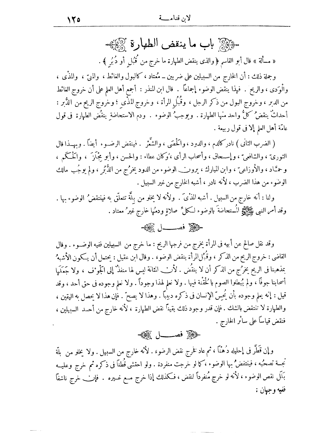 (٢٣٥) فَصْلٌ: وَقَدْ نَقَلَ صَالِحٌ، عَنْ أَبِيهِ " فِي الْمَرْأَةِ يَخْرُجُ مِنْ فَرْجِهَا الرِّيحُ: مَا خَرَجَ مِنْ السَّبِيلَيْنِ فَفِيهِ الْوُضُوءُ. وَقَالَ الْقَاضِي: خُرُوجُ الرِّيحِ مِنْ الذَّكَرِ وَقُبُلِ الْمَرْأَةِ يَنْقُضُ الْوُضُوءَ. وَقَالَ ابْنُ عُقَيْلٍ: يَحْتَمِلُ أَنْ يَكُونَ الْأَشْبَهُ بِمَذْهَبِنَا فِي الرِّيحِ يَخْرُجُ مِنْ الذَّكَرِ أَنْ لَا يَنْقُضَ؛ لِأَنَّ الْمَثَانَةَ لَيْسَ لَهَا مَنْفَذٌ إلَى الْجَوْفِ، وَلَا جَعَلَهَا أَصْحَابُنَا جَوْفًا، وَلَمْ يُبْطِلُوا الصَّوْمَ بِالْحُقْنَةِ فِيهِ، وَلَا نَعْلَمُ لِهَذَا وُجُودًا، وَلَا نَعْلَمُ وُجُودَهُ فِي حَقِّ أَحَدٍ. وَقَدْ قِيلَ: إنَّهُ يُعْلَمُ وُجُودُهُ بِأَنْ يُحِسَّ الْإِنْسَانُ فِي ذَكَرِهِ دَبِيبًا.