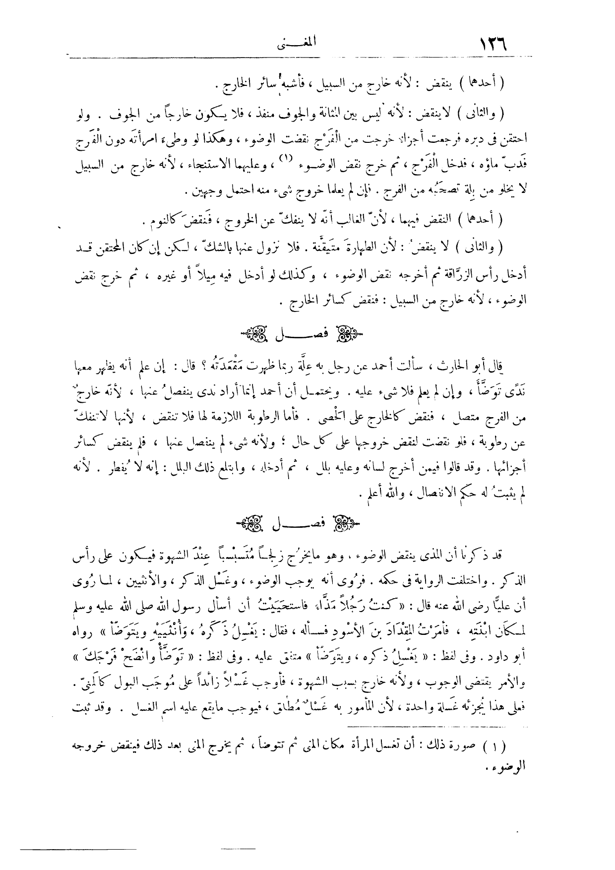 (٢٣٨) فَصْلٌ: قَدْ ذَكَرْنَا أَنَّ الْمَذْيَ يَنْقُضُ الْوُضُوءَ، وَهُوَ مَا يَخْرُجُ زَلِجًا مُتَسَبْسِبًا عِنْدَ الشَّهْوَةِ، فَيَكُونُ عَلَى رَأْسِ الذَّكَرِ. وَاخْتَلَفْت الرِّوَايَةُ فِي حُكْمِهِ فَرُوِيَ أَنَّهُ يُوجِبُ الْوُضُوءَ وَغَسْلَ الذَّكَرِ وَالْأُنْثَيَيْنِ؛ لِمَا رُوِيَ «أَنَّ عَلِيًّا - رَضِيَ اللَّهُ عَنْهُ - قَالَ: كُنْت رَجُلًا مَذَّاءً، فَاسْتَحْيَيْت أَنْ أَسْأَلَ رَسُولَ اللَّهِ - صَلَّى اللَّهُ عَلَيْهِ وَسَلَّمَ - لِمَكَانِ ابْنَتِهِ، فَأَمَرْت الْمِقْدَادَ بْنَ الْأَسْوَدِ فَسَأَلَهُ، فَقَالَ يَغْسِلُ ذَكَرَهُ وَأُنْثَيَيْهِ، وَيَتَوَضَّأُ» رَوَاهُ أَبُو دَاوُد وَفِي لَفْظٍ: " يَغْسِلُ ذَكَرَهُ وَيَتَوَضَّأُ " مُتَّفَقٌ عَلَيْهِ. وَفِي لَفْظٍ تَوَضَّأْ وَانْضَحْ فَرْجَك "