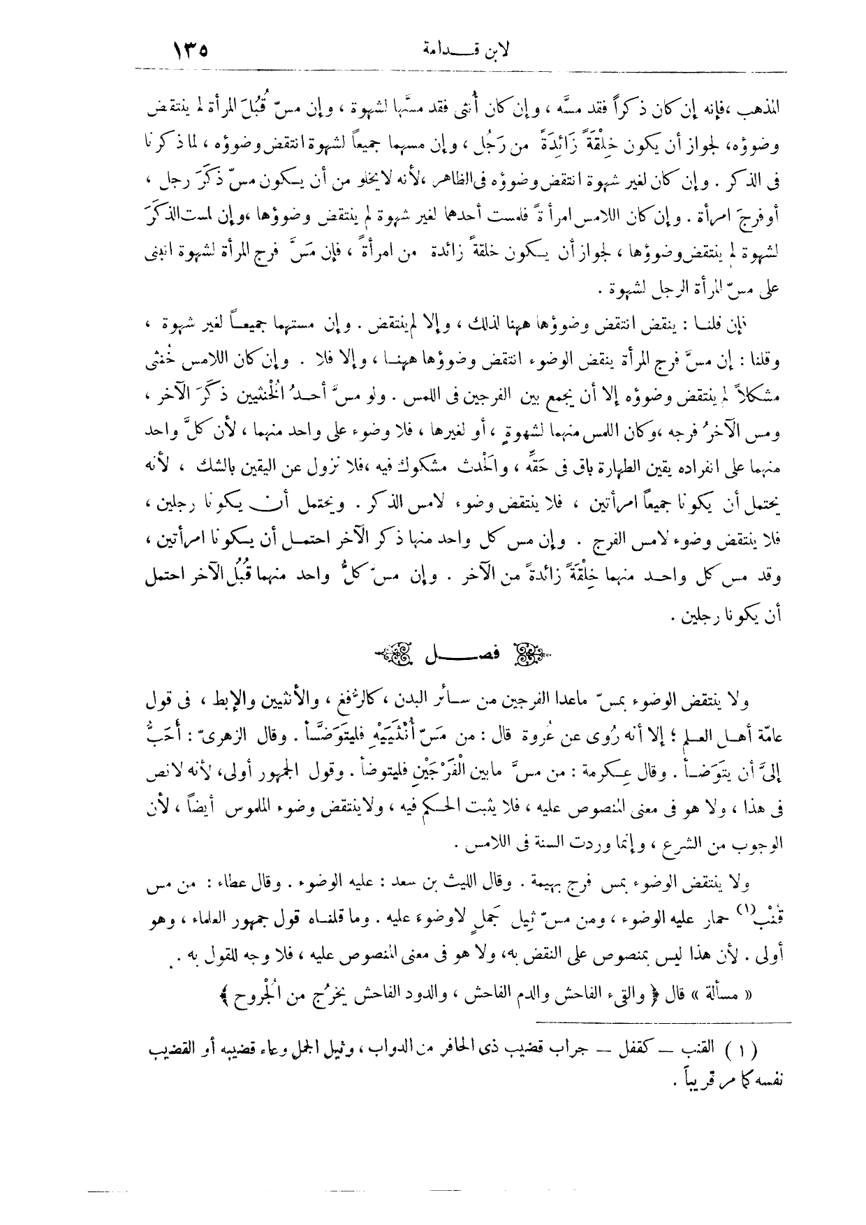 الْمَذْهَبِ؛ فَإِنَّهُ إنْ كَانَ ذَكَرًا فَقَدْ مَسَّهُ وَإِنْ كَانَ أُنْثَى فَقَدْ مَسَّهَا لِشَهْوَةِ. وَإِنْ مَسَّ قُبُلَ الْمَرْأَةِ لَمْ يَنْتَقِضْ وُضُوءُهُ؛ لِجَوَازِ أَنْ يَكُونَ خِلْقَةً زَائِدَةً مِنْ رَجُلٍ. وَإِنْ مَسَّهُمَا جَمِيعًا لِشَهْوَةِ، انْتَقَضَ وُضُوءُهُ؛ لِمَا ذَكَرْنَا فِي الذَّكَرِ.