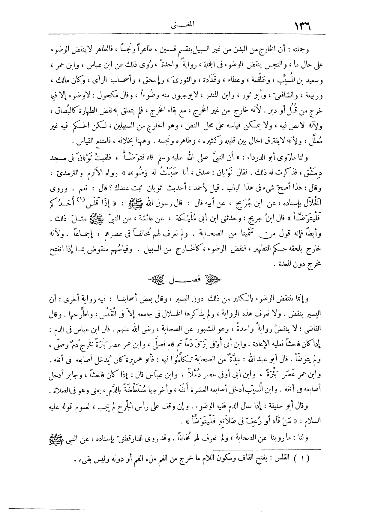 (٢٦٠) فَصْلٌ: وَإِنَّمَا يَنْتَقِضُ الْوُضُوءُ بِالْكَثِيرِ مِنْ ذَلِكَ دُونَ الْيَسِيرِ، وَقَالَ بَعْضُ أَصْحَابِنَا: فِيهِ رِوَايَةٌ أُخْرَى، أَنَّ الْيَسِيرَ يَنْقُضُ. وَلَا نَعْرِفُ هَذِهِ الرِّوَايَةَ، وَلَمْ يَذْكُرْهَا الْخَلَّالُ فِي " جَامِعِهِ " إلَّا فِي الْقَلْسِ، وَاطَّرَحَهَا وَقَالَ الْقَاضِي: لَا يَنْقُضُ، رِوَايَةً وَاحِدَةً. وَهُوَ الْمَشْهُورُ عَنْ الصَّحَابَةِ، - رَضِيَ اللَّهُ عَنْهُمْ -. قَالَ ابْنُ عَبَّاسٍ فِي الدَّمِ: إذَا كَانَ فَاحِشًا فَعَلَيْهِ الْإِعَادَةُ. وَابْنُ أَبِي أَوْفَى بَزَقَ دَمًا ثُمَّ قَامَ فَصَلَّى. وَابْنُ عُمَرَ عَصَرَ بَثْرَةً فَخَرَجَ دَمٌ، وَصَلَّى، وَلَمْ يَتَوَضَّأْ. قَالَ أَبُو عَبْدِ اللَّهِ: عِدَّةٌ مِنْ الصَّحَابَةِ تَكَلَّمُوا فِيهِ وَأَبُو هُرَيْرَةَ كَانَ يُدْخِلُ أَصَابِعَهُ فِي أَنْفِهِ، وَابْنُ عُمَرَ عَصَرَ بَثْرَةً وَابْنُ أَبِي أَوْفَى عَصَرَ دُمَّلًا وَابْنُ عَبَّاسٍ قَالَ: إذَا كَانَ فَاحِشًا. وَجَابِرٌ أَدْخَلَ أَصَابِعَهُ فِي أَنْفِهِ، وَابْنُ الْمُسَيِّبِ أَدْخُلَ أَصَابِعَهُ الْعَشَرَةَ فِي أَنْفِهِ، وَأَخْرَجَهَا مُتَلَطِّخَةً بِالدَّمِ. يَعْنِي: وَهُوَ فِي الصَّلَاةِ. وَقَالَ أَبُو حَنِيفَةَ: إذَا سَالَ الدَّمُ فَفِيهِ الْوُضُوءُ، وَإِنْ وَقَفَ عَلَى رَأْسِ الْجُرْحِ، لَمْ يَجِبْ؛ لِعُمُومِ قَوْلِهِ - عَلَيْهِ السَّلَامُ -: «مَنْ قَاءَ أَوْ رَعَفَ فِي صَلَاتِهِ فَلْيَتَوَضَّأْ.» وَلَنَا مَا رَوَيْنَا عَنْ الصَّحَابَةِ، وَلَمْ نَعْرِفْ لَهُمْ مُخَالِفًا. وَقَدْ رَوَى الدَّارَقُطْنِيّ، بِإِسْنَادِهِ، عَنْ النَّبِيِّ - صَلَّى اللَّهُ عَلَيْهِ وَسَلَّمَ -