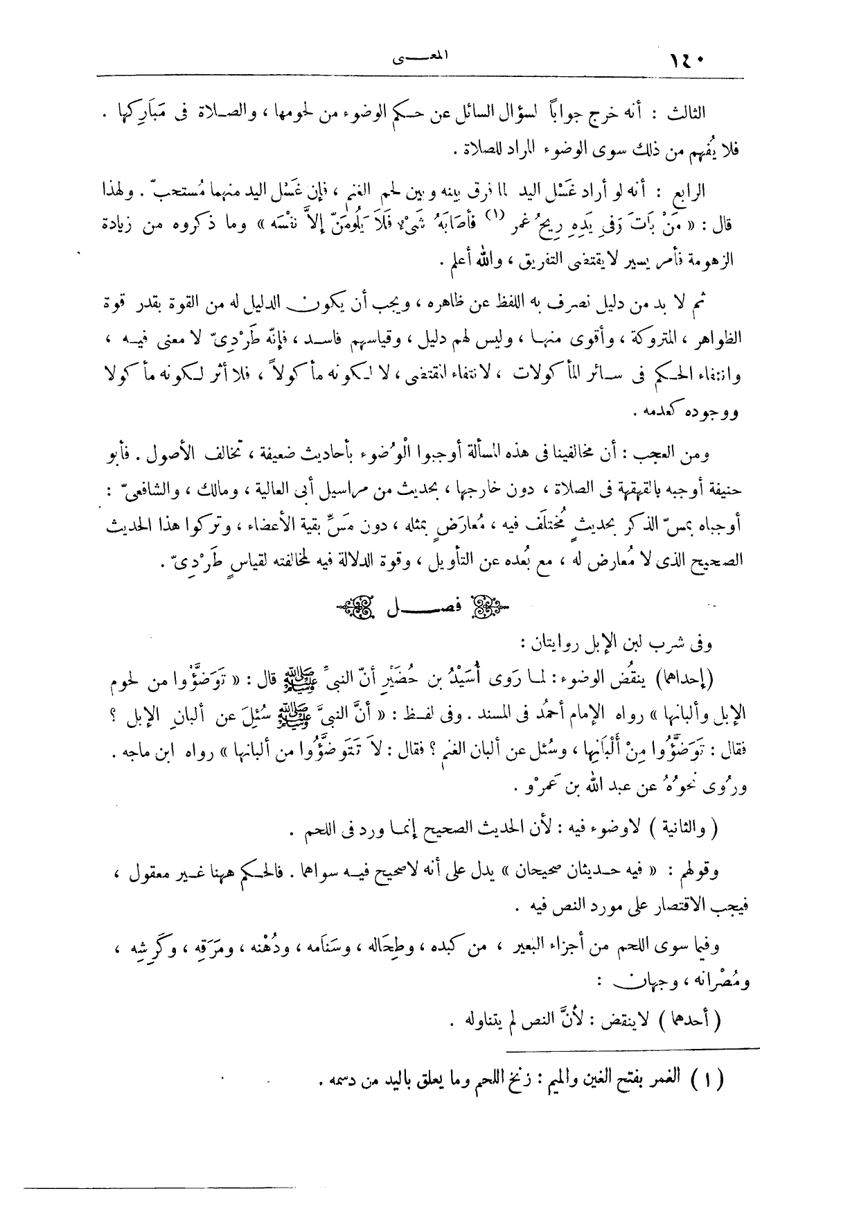 (٢٦٦) فَصْلٌ: وَفِي شُرْبِ لَبَنِ الْإِبِلِ رِوَايَتَانِ: إحْدَاهُمَا يَنْقُضُ الْوُضُوءَ؛ لِمَا رَوَى أُسَيْدُ بْنُ حُضَيْرٍ، أَنَّ النَّبِيَّ - صَلَّى اللَّهُ عَلَيْهِ وَسَلَّمَ - قَالَ: «تَوَضَّئُوا مِنْ لُحُومِ الْإِبِلِ وَأَلْبَانِهَا» رَوَاهُ الْإِمَامُ أَحْمَدُ فِي الْمُسْنَدِ وَفِي لَفْظٍ: أَنَّ النَّبِيَّ - صَلَّى اللَّهُ عَلَيْهِ وَسَلَّمَ - سُئِلَ عَنْ أَلْبَانِ الْإِبِلِ، فَقَالَ: تَوَضَّئُوا مِنْ أَلْبَانِهَا " وَسُئِلَ عَنْ أَلْبَانِ الْغَنَمِ، فَقَالَ: " لَا تَتَوَضَّئُوا مِنْ أَلْبَانِهَا ". رَوَاهُ ابْنُ مَاجَهْ، وَرُوِيَ نَحْوُهُ عَنْ عَبْدِ اللَّهِ بْنِ عَمْرٍو. وَالثَّانِيَةُ، لَا وُضُوءَ فِيهِ؛ لِأَنَّ الْحَدِيثَ الصَّحِيحَ إنَّمَا وَرَدَ فِي اللَّحْمِ.