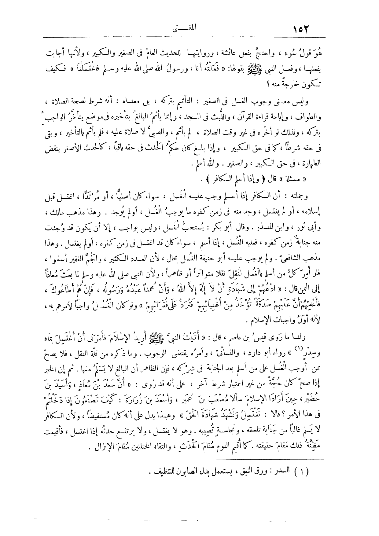 وَلَنَا: مَا رَوَى «قَيْسُ بْنُ عَاصِمٍ، قَالَ: أَتَيْت النَّبِيَّ - صَلَّى اللَّهُ عَلَيْهِ وَسَلَّمَ - أُرِيدُ الْإِسْلَامَ فَأَمَرَنِي أَنْ أَغْتَسِلَ بِمَاءٍ وَسِدْرٍ» رَوَاهُ أَبُو دَاوُد، وَالنَّسَائِيُّ وَأَمْرُهُ يَقْتَضِي الْوُجُوبَ، وَمَا ذَكَرُوهُ مِنْ قِلَّةِ النَّقْلِ، فَلَا يَصِحُّ مِمَّنْ أَوْجَبَ الْغُسْلَ عَلَى مَنْ أَسْلَمَ بَعْدَ الْجَنَابَةِ فِي شِرْكِهِ، فَإِنَّ الظَّاهِرَ أَنَّ الْبَالِغَ لَا يَسْلَمُ مِنْهَا، ثُمَّ إنَّ الْخَبَرَ إذَا صَحَّ كَانَ حُجَّةً مِنْ غَيْرِ اعْتِبَارِ شَرْطٍ آخَرَ، عَلَى أَنَّهُ قَدْ رُوِيَ، أَنَّ سَعْدَ بْنَ مُعَاذٍ، وَأُسَيْدَ بْنَ حُضَيْرٍ، حِينَ أَرَادَا الْإِسْلَامَ، سَأَلَا مُصْعَبَ بْنَ عُمَيْرٍ وَأَسْعَدَ بْنَ زُرَارَةَ: كَيْفَ تَصْنَعُونَ إذَا دَخَلْتُمْ فِي هَذَا الْأَمْرِ؟ قَالَا: نَغْتَسِلُ، وَنَشْهَدُ شَهَادَةَ الْحَقِّ.
