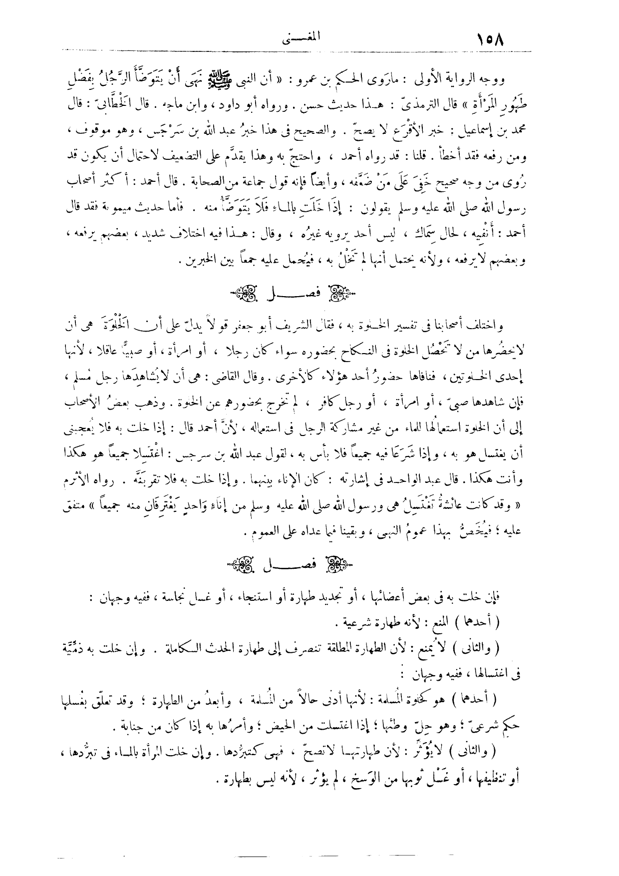 (٣٠٢) فَصْلٌ: وَاخْتَلَفَ أَصْحَابُنَا فِي تَفْسِيرِ الْخَلْوَةِ بِهِ، فَقَالَ الشَّرِيفُ أَبُو جَعْفَرٍ قَوْلًا يَدُلُّ عَلَى أَنَّ الْخَلْوَةَ هِيَ أَنْ لَا يَحْضُرَهَا مَنْ لَا تَحْصُلُ الْخَلْوَةُ فِي النِّكَاحِ بِحُضُورِهِ، سَوَاءٌ كَانَ رَجُلًا، أَوْ امْرَأَةً، أَوْ صَبِيًّا عَاقِلًا؛ لِأَنَّهَا إحْدَى الْخَلْوَتَيْنِ، فَنَافَاهَا حُضُورُ أَحَدِ هَؤُلَاءِ كَالْأُخْرَى. وَقَالَ الْقَاضِي: هِيَ أَنْ لَا يُشَاهِدَهَا رَجُلٌ مُسْلِمٌ، فَإِنْ شَاهَدَهَا صَبِيٌّ أَوْ امْرَأَةٌ أَوْ رَجُلٌ كَافِرٌ، لَمْ تَخْرُجْ بِحُضُورِهِمْ عَنْ الْخَلْوَةِ. وَذَهَبَ بَعْضُ الْأَصْحَابِ إلَى أَنَّ الْخَلْوَةَ اسْتِعْمَالُهَا لِلْمَاءِ مِنْ غَيْرِ مُشَارَكَةِ الرَّجُلِ فِي اسْتِعْمَالِهِ؛ لِأَنَّ أَحْمَدَ قَالَ: إذَا خَلَتْ بِهِ فَلَا يُعْجِبُنِي أَنْ يَغْتَسِلَ هُوَ بِهِ.