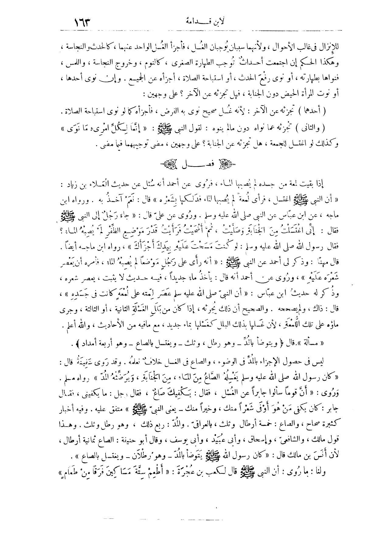 وَرُوِيَ أَنَّ قَوْمًا سَأَلُوا جَابِرًا عَنْ الْغُسْلِ، فَقَالَ: يَكْفِيك صَاعٌ. فَقَالَ رَجُلٌ: مَا يَكْفِينِي. فَقَالَ جَابِرٌ: كَانَ يَكْفِي مَنْ هُوَ أَوْفَى شَعْرًا مِنْك، وَخَيْرٌ مِنْك. يَعْنِي النَّبِيَّ - صَلَّى اللَّهُ عَلَيْهِ وَسَلَّمَ - مُتَّفَقٌ عَلَيْهِ. وَفِيهِ أَخْبَارٌ كَثِيرَةٌ صِحَاحٌ، وَالصَّاعُ: خَمْسَةُ أَرْطَالٍ وَثُلْثٌ بِالْعِرَاقِيِّ، وَالْمُدُّ: رُبُعُ ذَلِكَ، وَهُوَ رِطْلٌ وَثُلُثٌ.