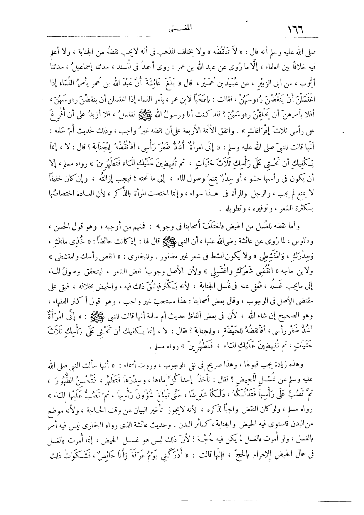 " وَلَا يَخْتَلِفُ الْمَذْهَبُ فِي أَنَّهُ لَا يَجِبُ نَقْضُهُ مِنْ الْجَنَابَةِ، وَلَا أَعْلَمُ فِيهِ خِلَافًا بَيْنَ الْعُلَمَاءِ، إلَّا مَا رُوِيَ عَنْ عَبْدِ اللَّهِ بْنِ عُمَرَ، وَرَوَى أَحْمَدُ فِي " الْمُسْنَدِ "، حَدَّثَنَا إسْمَاعِيلُ، حَدَّثَنَا أَيُّوبُ، عَنْ أَبِي الزُّبَيْرِ، عَنْ عُبَيْدِ بْنِ عُمَيْرٍ، قَالَ. «بَلَغَ عَائِشَةَ أَنَّ عَبْدَ اللَّهِ بْنَ عُمَرَ يَأْمُرُ النِّسَاءَ إذَا اغْتَسَلْنَ أَنْ يَنْقُضْنَ رُءُوسَهُنَّ، فَقَالَتْ: يَا عَجَبًا لِابْنِ عُمَرَ، يَأْمُرُ النِّسَاءَ إذَا اغْتَسَلْنَ أَنْ يَنْقُضْنَ رُءُوسَهُنَّ، أَفَلَا يَأْمُرُهُنَّ أَنْ يَحْلِقْنَ، رُءُوسَهُنَّ، لَقَدْ كُنْت أَنَا وَرَسُولُ اللَّهِ - صَلَّى اللَّهُ عَلَيْهِ وَسَلَّمَ - نَغْتَسِلُ فَلَا أَزِيدُ عَلَى أَنْ أُفْرِغَ عَلَى رَأْسِي ثَلَاثَ إفْرَاغَاتٍ» .