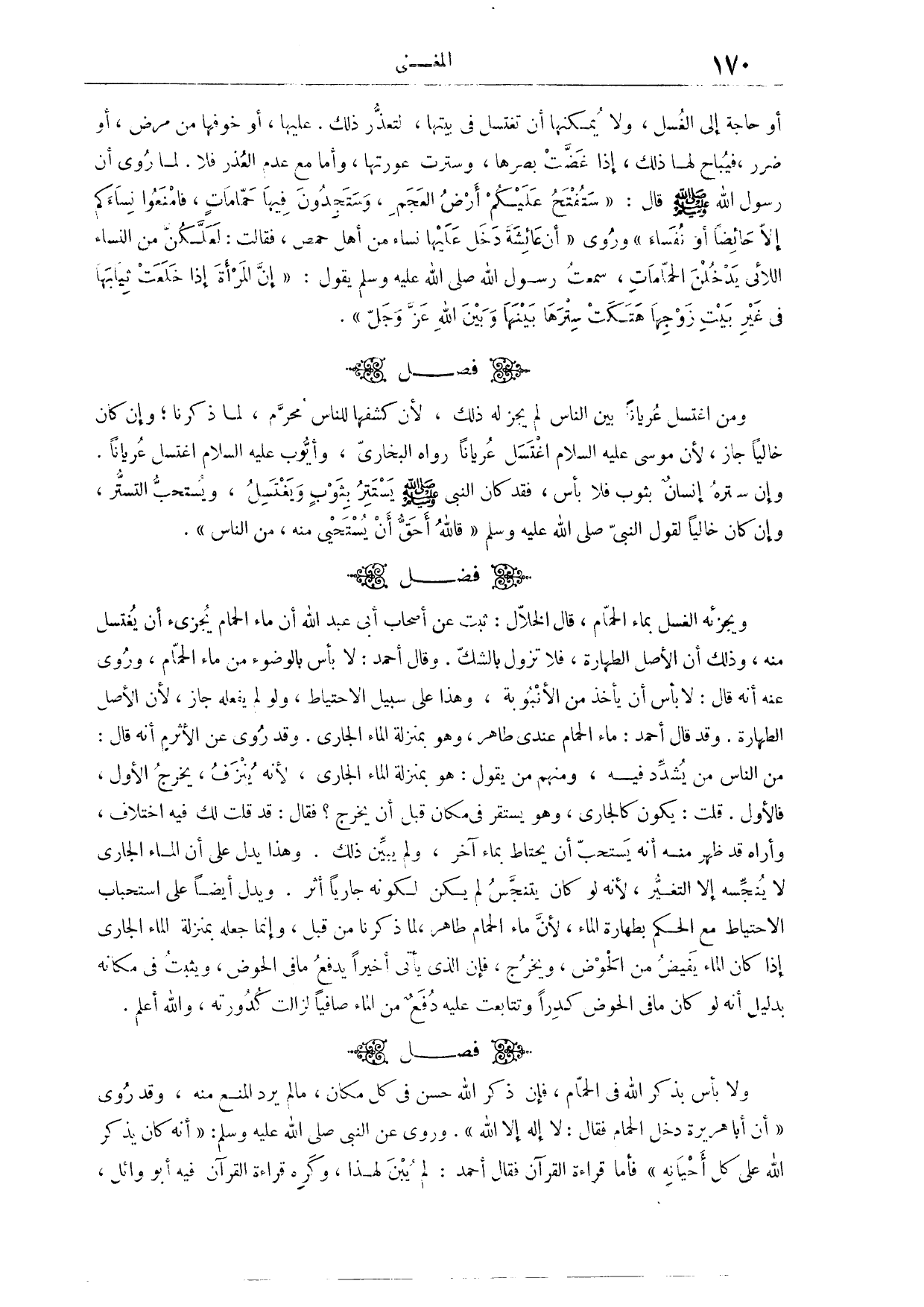 (٣٢٦) فَصْلٌ: وَيُجْزِئُهُ الْغُسْلُ بِمَاءِ الْحَمَّامِ. قَالَ الْخَلَّالُ: ثَبَتَ عَنْ أَصْحَابِ أَبِي عَبْدِ اللَّهِ، أَنَّ مَاءَ الْحَمَّامِ يُجْزِئُ أَنْ يُغْتَسَلَ بِهِ، وَلَا يُغْتَسَلُ مِنْهُ؛ وَذَلِكَ أَنَّ الْأَصْلَ الطَّهَارَةُ، فَلَا تَزُولُ بِالشَّكِّ. وَقَالَ أَحْمَدُ: لَا بَأْسَ بِالْوُضُوءِ مِنْ مَاءِ الْحَمَّامِ. وَرُوِيَ عَنْهُ أَنَّهُ قَالَ: لَا بَأْسَ أَنْ يَأْخُذَ مِنْ الْأُنْبُوبَةِ. وَهَذَا عَلَى سَبِيلِ الِاحْتِيَاطِ، وَلَوْ لَمْ يَفْعَلْهُ جَازَ؛ لِأَنَّ الْأَصْلَ الطَّهَارَةُ، وَقَدْ قَالَ أَحْمَدُ: مَاءُ الْحَمَّامِ عِنْدِي طَاهِرٌ، وَهُوَ بِمَنْزِلَةِ الْمَاءِ الْجَارِي. وَقَدْ رَوَى عَنْهُ الْأَثْرَمُ، أَنَّهُ قَالَ: مِنْ النَّاسِ مَنْ يُشَدِّدُ فِيهِ، وَمِنْهُمْ مَنْ يَقُولُ: هُوَ بِمَنْزِلَةِ الْمَاءِ الْجَارِي؛ لِأَنَّهُ يُنْزَفُ، يَخْرُجُ الْأَوَّلُ فَالْأَوَّلُ. قُلْت: يَكُونُ كَالْجَارِي، وَهُوَ يَسْتَقِرُّ فِي مَكَان قَبْلَ أَنْ يَخْرُجَ؟ ، فَقَالَ: قَدْ قُلْت لَك فِيهِ اخْتِلَافٌ. وَأَرَاهُ قَدْ ظَهَرَ مِنْهُ أَنَّهُ يُسْتَحَبُّ أَنْ يَحْتَاطَ بِمَاءٍ آخَرَ، وَلَمْ يُبَيِّنْ لَهُ ذَلِكَ.