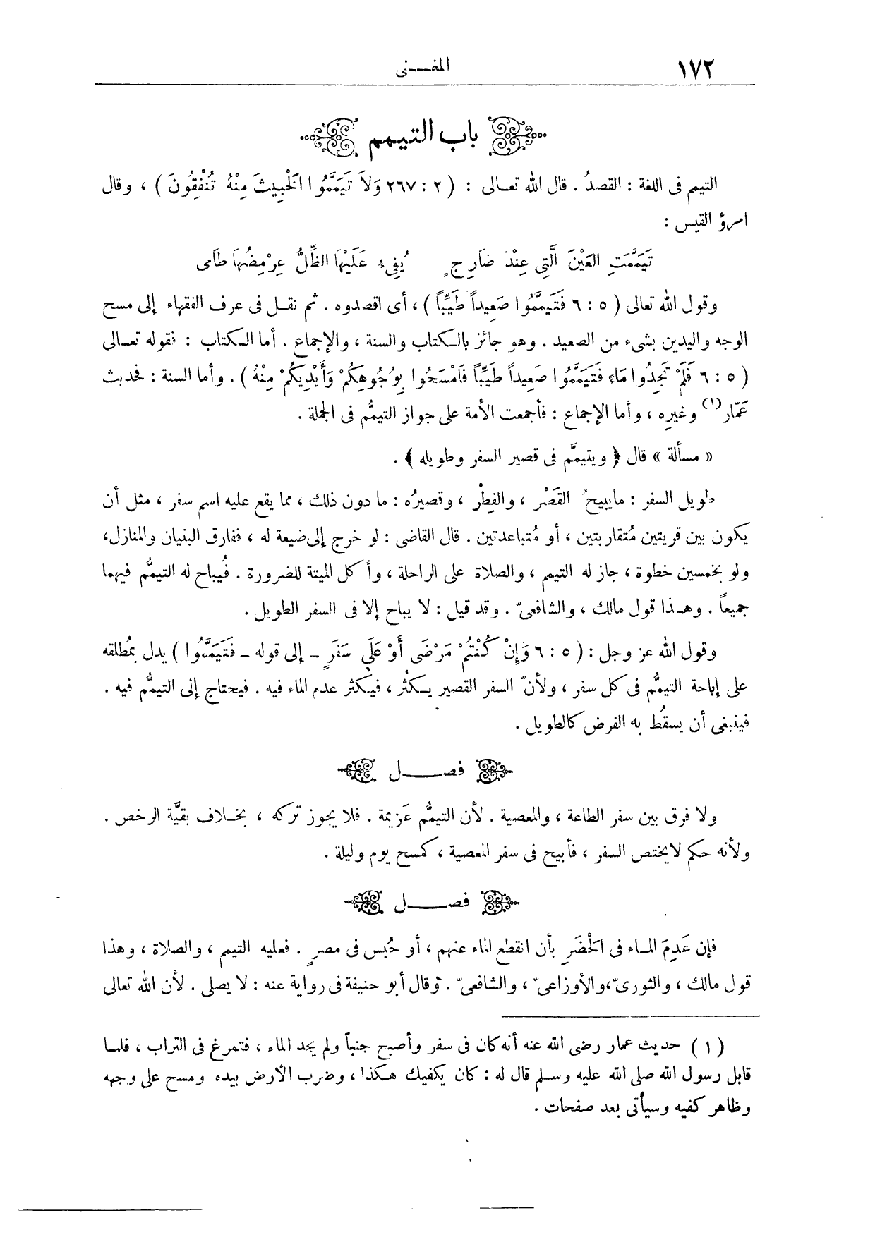 (٣٣٠) فَصْلٌ: وَلَا فَرْقَ بَيْنَ سَفَرِ الطَّاعَةِ وَالْمَعْصِيَةِ؛ لِأَنَّ التَّيَمُّمَ عَزِيمَةٌ، فَلَا يَجُوزُ تَرْكُهُ بِخِلَافِ بَقِيَّةِ الرُّخَصِ؛ وَلِأَنَّهُ حُكْمٌ لَا يَخْتَصُّ بِالسَّفَرِ، فَأُبِيحَ فِي سَفَرِ الْمَعْصِيَةِ، كَمَسْحِ يَوْمٍ وَلَيْلَةٍ.