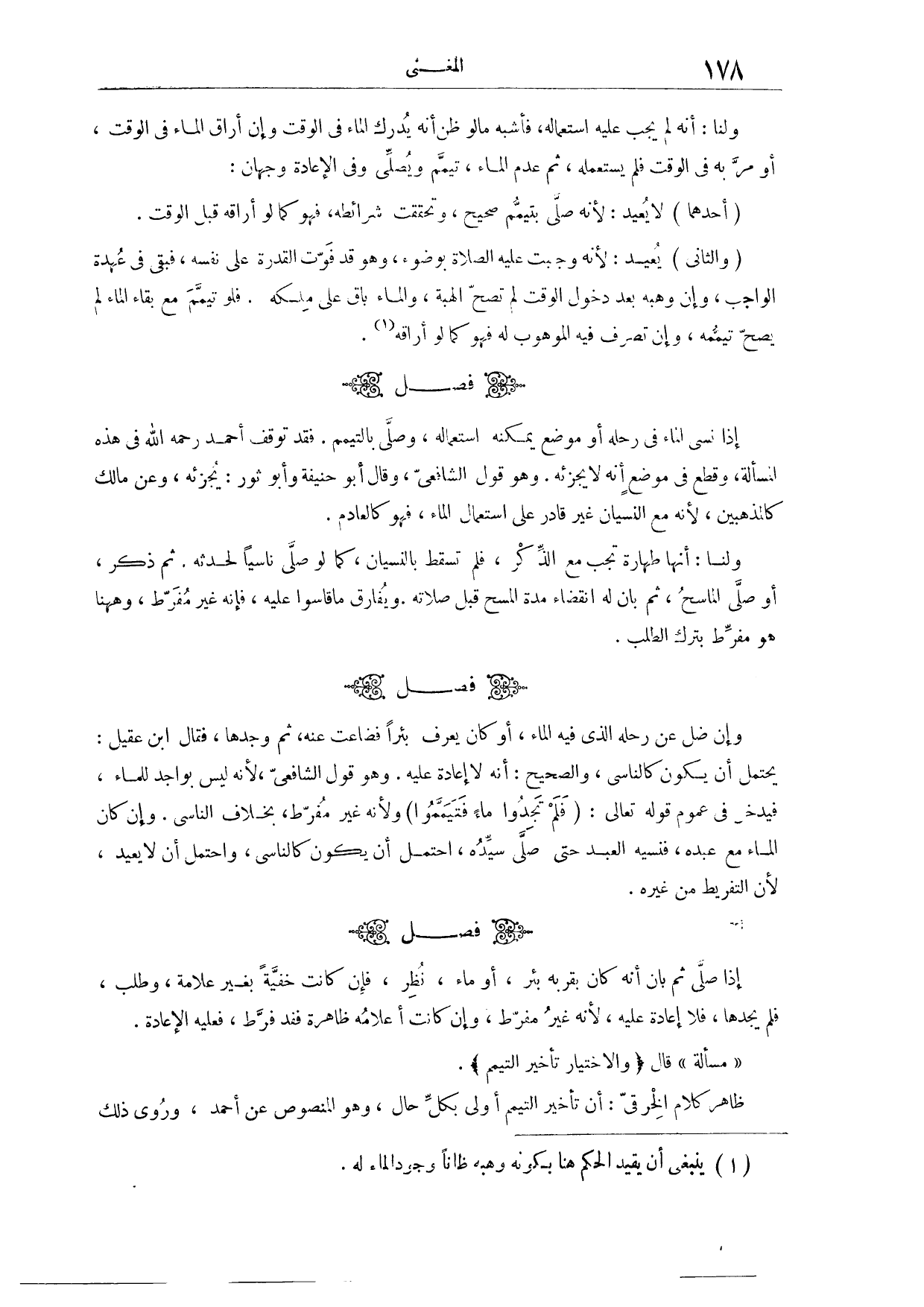 (٣٤٣) فَصْلٌ: إذَا نَسِيَ الْمَاءَ فِي رَحْلِهِ، أَوْ مَوْضِعٍ يُمْكِنُهُ اسْتِعْمَالُهُ، وَصَلَّى بِالتَّيَمُّمِ. فَقَدْ تَوَقَّفَ أَحْمَدُ، - رَحِمَهُ اللَّهُ - فِي هَذِهِ الْمَسْأَلَةِ، وَقَطَعَ فِي مَوْضِعٍ أَنَّهُ لَا يُجْزِئُهُ. وَهُوَ قَوْلُ الشَّافِعِيِّ. وَقَالَ أَبُو حَنِيفَةَ، وَأَبُو ثَوْرٍ: يُجْزِئُهُ. وَعَنْ مَالِكٍ كَالْمَذْهَبَيْنِ؛ لِأَنَّهُ مَعَ النِّسْيَانِ غَيْرُ قَادِرٍ عَلَى اسْتِعْمَالِ الْمَاءِ، فَهُوَ كَالْعَادِمِ. وَلَنَا أَنَّهَا طَهَارَةٌ تَجِبُ مَعَ الذِّكْرِ، فَلَمْ تَسْقُطْ بِالنِّسْيَانِ، كَمَا لَوْ صَلَّى نَاسِيًا لِحَدَثِهِ، ثُمَّ ذَكَرَ، أَوْ صَلَّى الْمَاسِحُ، ثُمَّ بَانَ لَهُ انْقِضَاءُ مُدَّةِ الْمَسْحِ قَبْلَ صَلَاتِهِ، وَيُفَارِقُ مَا قَاسُوا عَلَيْهِ؛ فَإِنَّهُ غَيْرُ مُفَرِّطٍ، وَهَا هُنَا هُوَ مُفَرِّطٌ بِتَرْكِ الطَّلَبِ.