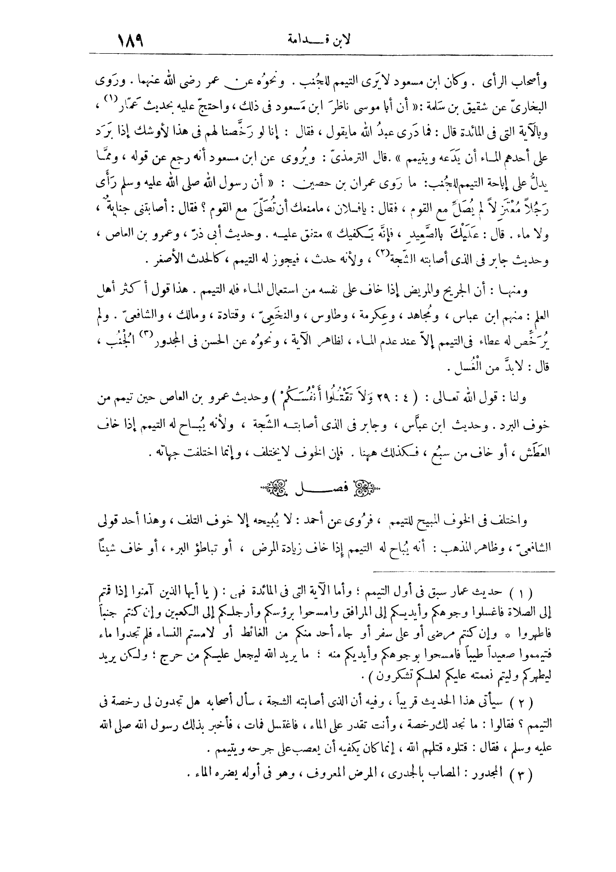 وَمِنْهَا أَنَّ الْجَرِيحَ وَالْمَرِيضَ إذَا خَافَ عَلَى نَفْسِهِ مِنْ اسْتِعْمَالِ الْمَاءِ، جَازَ لَهُ التَّيَمُّمُ، هَذَا قَوْلُ أَكْثَرِ أَهْلِ الْعِلْمِ؛ مِنْهُمْ ابْنُ عَبَّاسٍ، وَمُجَاهِدٌ، وَعِكْرِمَةُ، وَطَاوُسٌ، وَالنَّخَعِيُّ، وَقَتَادَةُ، وَمَالِكٌ، وَالشَّافِعِيُّ. وَلَمْ يُرَخِّصْ لَهُ عَطَاءٌ فِي التَّيَمُّمِ إلَّا عِنْدَ عَدَمِ الْمَاءِ؛ لِظَاهِرِ الْآيَةِ، وَنَحْوُهُ عَنْ الْحَسَنِ فِي الْمَجْدُورِ الْجُنُبِ، قَالَ: لَا بُدَّ مِنْ الْغُسْلِ وَلَنَا قَوْلُ اللَّهِ تَعَالَى: {وَلا تَقْتُلُوا أَنْفُسَكُمْ} [النساء: ٢٩] . وَحَدِيثُ عَمْرِو بْنِ الْعَاصِ حِينَ تَيَمَّمَ مِنْ خَوْفِ الْبَرْدِ، وَحَدِيثُ ابْنِ عَبَّاسٍ، وَجَابِرٍ فِي الَّذِي أَصَابَتْهُ الشَّجَّةُ؛ وَلِأَنَّهُ يُبَاحُ لَهُ التَّيَمُّمُ إذَا خَافَ الْعَطَشَ، أَوْ خَافَ مِنْ سَبُعٍ، فَكَذَلِكَ هَاهُنَا، فَإِنَّ الْخَوْفَ لَا يَخْتَلِفُ، وَإِنَّمَا اخْتَلَفَتْ جِهَاتُهُ.