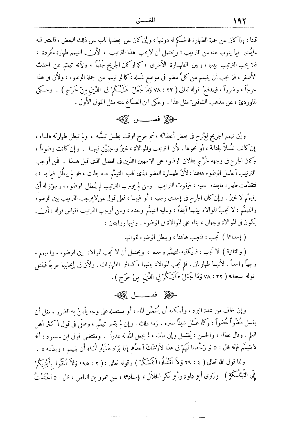 قُلْنَا: إذَا كَانَ عَنْ جُمْلَةِ الطَّهَارَةِ، فَالْحُكْمُ لَهُ دُونَهَا، وَإِنْ كَانَ عَنْ بَعْضِهَا، نَابَ عَنْ ذَلِكَ الْبَعْضِ، فَاعْتُبِرَ فِيهِ مَا يُعْتَبَرُ فِيمَا يَنُوبُ عَنْهُ مِنْ التَّرْتِيبِ. وَيَحْتَمِلُ أَنْ لَا يَجِبَ هَذَا التَّرْتِيبُ؛ لِأَنَّ التَّيَمُّمَ طَهَارَةٌ مُفْرَدَةٌ، فَلَا يَجِبُ التَّرْتِيبُ بَيْنَهَا وَبَيْنَ الطَّهَارَةِ الْأُخْرَى، كَمَا لَوْ كَانَ الْجَرِيحُ جُنُبًا؛ وَلِأَنَّهُ تَيَمَّمَ عَنْ الْحَدَثِ الْأَصْغَرِ، فَلَمْ يَجِبْ أَنْ يَتَيَمَّمَ عَنْ كُلِّ عُضْوٍ فِي مَوْضِعِ غَسْلِهِ، كَمَا لَوْ تَيَمَّمَ عَنْ جُمْلَةِ الْوُضُوءِ؛ وَلِأَنَّ فِي هَذَا حَرَجًا وَضَرَرًا، فَيَنْدَفِعُ بِقَوْلِهِ تَعَالَى: {وَمَا جَعَلَ عَلَيْكُمْ فِي الدِّينِ مِنْ حَرَجٍ} [الحج: ٧٨] . وَحَكَى الْمَاوَرْدِيُّ، عَنْ مَذْهَبِ الشَّافِعِيِّ مِثْلَ هَذَا. وَحَكَى ابْنُ الصَّبَّاغِ عَنْهُ مِثْلَ الْقَوْلِ الْأَوَّلِ.