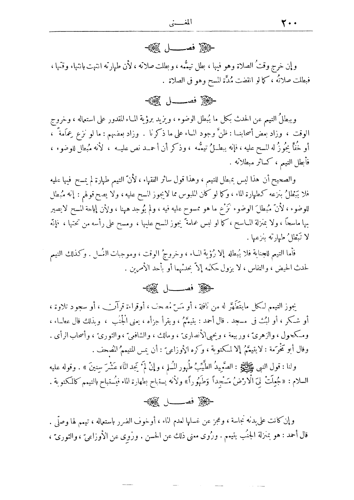 (٣٩٠) فَصْلٌ: وَيَبْطُلُ التَّيَمُّمُ عَنْ الْحَدَثِ بِكُلِّ مَا يُبْطِلُ الْوُضُوءَ، وَيَزِيدُ بِرُؤْيَةِ الْمَاءِ الْمَقْدُورِ عَلَى اسْتِعْمَالِهِ، وَخُرُوجِ الْوَقْتِ، وَزَادَ بَعْضُ أَصْحَابِنَا ظَنَّ وُجُودِ الْمَاءِ، عَلَى مَا ذَكَرْنَا، وَزَادَ بَعْضُهُمْ مَا لَوْ نَزَعَ عِمَامَةً أَوْ خُفًّا يَجُوزُ لَهُ الْمَسْحُ عَلَيْهِ؛ فَإِنَّهُ يَبْطُلُ تَيَمُّمُهُ. وَذُكِرَ أَنَّ أَحْمَدَ نَصَّ عَلَيْهِ؛ لِأَنَّهُ مُبْطِلٌ لِلْوُضُوءِ، فَأَبْطَلَ التَّيَمُّمَ، كَسَائِرِ مُبْطِلَاتِهِ. وَالصَّحِيحُ أَنَّ هَذَا لَيْسَ بِمُبْطِلٍ لِلتَّيَمُّمِ، وَهَذَا قَوْلُ سَائِرِ الْفُقَهَاءِ؛ لِأَنَّ التَّيَمُّمَ طَهَارَةٌ لَمْ يَمْسَحْ فِيهَا عَلَيْهِ، فَلَا يَبْطُلُ بِنَزْعِهِ، كَطَهَارَةِ الْمَاءِ، وَكَمَا لَوْ كَانَ الْمَلْبُوسُ مِمَّا لَا يَجُوزُ الْمَسْحُ عَلَيْهِ، وَلَا يَصِحُّ قَوْلُهُمْ: إنَّهُ مُبْطِلٌ لِلْوُضُوءِ؛ لِأَنَّ مُبْطِلَ الْوُضُوءِ نَزْعُ مَا هُوَ مَمْسُوحٌ عَلَيْهِ فِيهِ، وَلَمْ يُوجَدْ هَاهُنَا؛ وَلِأَنَّ إبَاحَةَ الْمَسْحِ لَا يَصِيرُ بِهَا مَاسِحًا، وَلَا بِمَنْزِلَةِ الْمَاسِحِ، كَمَا لَوْ لَبِسَ عِمَامَةً يَجُوزُ الْمَسْحُ عَلَيْهَا، وَمَسَحَ عَلَى رَأْسِهِ مِنْ تَحْتَهَا، فَإِنَّهُ لَا تَبْطُلُ طَهَارَتُهُ بِنَزْعِهَا.