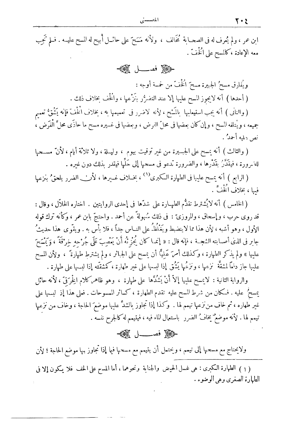 (٣٩٧) فَصْلٌ: وَيُفَارِقُ مَسْحُ الْجَبِيرَةِ مَسْحَ الْخُفِّ مِنْ خَمْسَةِ أَوْجُهٍ: أَحَدُهَا، أَنَّهُ لَا يَجُوزُ الْمَسْحُ عَلَيْهَا إلَّا عِنْدَ الضَّرَرِ بِنَزْعِهَا، وَالْخُفُّ بِخِلَافِ ذَلِكَ.