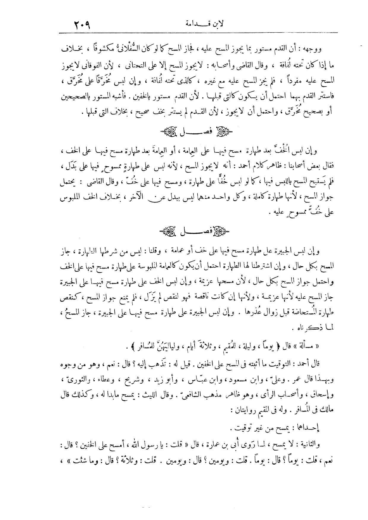 (٤١٠) مَسْأَلَةٌ: قَالَ: (يَوْمًا وَلَيْلَةً لِلْمُقِيمِ، وَثَلَاثَةَ أَيَّامٍ وَلَيَالِيهِنَّ لِلْمُسَافِرِ) . قَالَ أَحْمَدُ: التَّوْقِيتُ مَا أَثْبَتَهُ فِي الْمَسْحِ عَلَى الْخُفَّيْنِ. قِيلَ لَهُ: تَذْهَبُ إلَيْهِ؟ قَالَ: نَعَمْ، وَهُوَ مِنْ وُجُوهٍ. وَبِهَذَا قَالَ عُمَرُ، وَعَلِيٌّ، وَابْنُ مَسْعُودٍ، وَابْنُ عَبَّاسٍ، وَأَبُو زَيْدٍ، وَشُرَيْحٌ، وَعَطَاءٌ، وَالثَّوْرِيُّ، وَإِسْحَاقُ، وَأَصْحَابُ الرَّأْيِ، وَهُوَ ظَاهِرُ مَذْهَبِ الشَّافِعِيِّ. وَقَالَ اللَّيْثُ: يَمْسَحُ مَا بَدَا لَهُ. وَكَذَلِكَ قَالَ مَالِكٌ فِي الْمُسَافِرِ. وَلَهُ فِي الْمُقِيمِ رِوَايَتَانِ؛ إحْدَاهُمَا يَمْسَحُ، مِنْ غَيْرِ تَوْقِيتٍ.