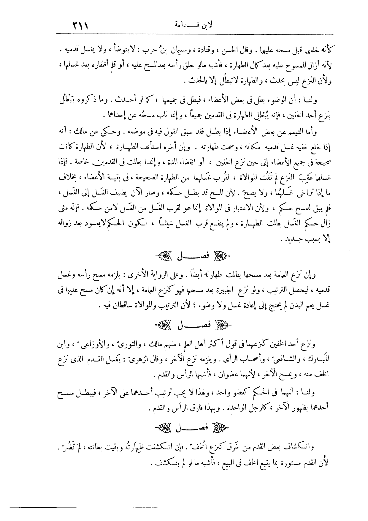 كَأَنَّهُ خَلَعَهُمَا قَبْلَ مَسْحِهِ عَلَيْهِمَا. وَقَالَ الْحَسَنُ، وَقَتَادَةُ، وَسُلَيْمَانُ بْنُ حَرْبٍ: لَا يَتَوَضَّأُ وَلَا يَغْسِلُ قَدَمَيْهِ؛ لِأَنَّهُ أَزَالَ الْمَمْسُوحَ عَلَيْهِ بَعْدَ كَمَالِ الطَّهَارَةِ، فَأَشْبَهَ مَا لَوْ حَلَقَ رَأْسَهُ بَعْدَ الْمَسْحِ عَلَيْهِ، أَوْ قَلَّمَ أَظْفَارَهُ بَعْدَ غَسْلِهَا؛ وَلِأَنَّ النَّزْعَ لَيْسَ بِحَدَثٍ، وَالطَّهَارَةُ لَا تَبْطُلُ إلَّا بِالْحَدَثِ. وَلَنَا أَنَّ الْوُضُوءَ بَطَلَ فِي بَعْضِ الْأَعْضَاءِ، فَبَطَلَ فِي جَمِيعِهَا، كَمَا لَوْ أَحْدَثَ، وَمَا ذَكَرُوهُ يَبْطُلُ بِنَزْعِ أَحَدِ الْخُفَّيْنِ، فَإِنَّهُ يُبْطِلُ الطَّهَارَةَ فِي الْقَدَمَيْنِ جَمِيعًا، وَإِنَّمَا نَابَ مَسْحُهُ عَنْ إحْدَاهُمَا. وَأَمَّا التَّيَمُّمُ عَنْ بَعْضِ الْأَعْضَاءِ إذَا بَطَلَ، فَقَدْ سَبَقَ الْقَوْلُ فِيهِ فِي مَوْضِعِهِ.