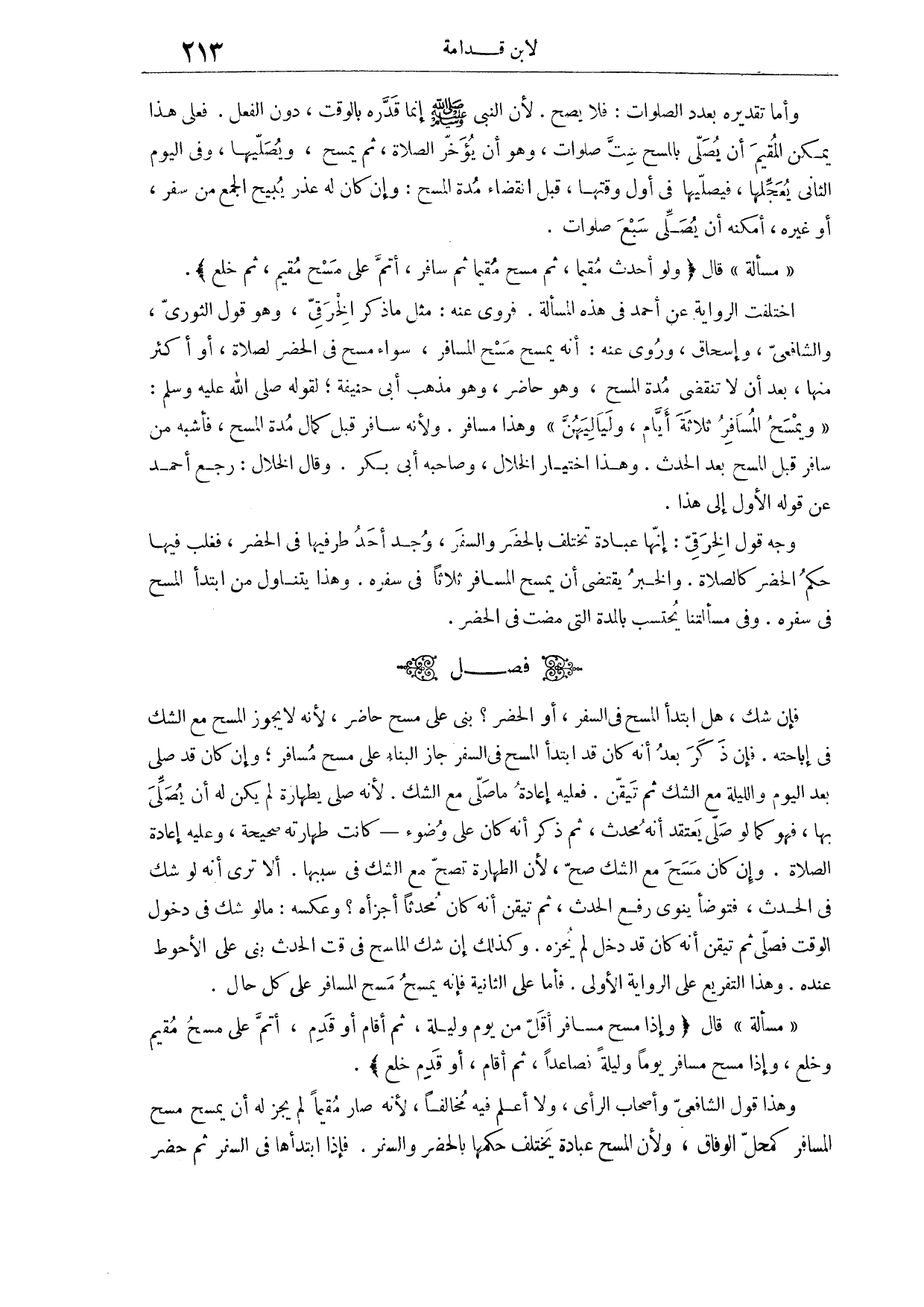 (٤١٩) مَسْأَلَةٌ: قَالَ (وَلَوْ أَحْدَثَ مُقِيمًا، ثُمَّ مَسَحَ مُقِيمًا، ثُمَّ سَافَرَ، أَتَمَّ عَلَى مَسْحِ مُقِيمٍ، ثُمَّ خَلَعَ) اخْتَلَفَتْ الرِّوَايَةُ عَنْ أَحْمَدَ فِي هَذِهِ الْمَسْأَلَةِ؛ فَرُوِيَ عَنْهُ: مِثْلُ مَا ذَكَرَ الْخِرَقِيِّ وَهُوَ قَوْلُ الثَّوْرِيِّ، وَالشَّافِعِيِّ، وَإِسْحَاقَ، وَرُوِيَ عَنْهُ: أَنَّهُ يَمْسَحُ مَسْحَ الْمُسَافِرِ، سَوَاءٌ مَسَحَ فِي الْحَضَرِ لِصَلَاةٍ أَوْ أَكْثَرَ مِنْهَا بَعْدَ أَنْ لَا تَنْقَضِيَ مُدَّةُ الْمَسْحِ، وَهُوَ حَاضِرٌ. وَهُوَ مَذْهَبُ أَبِي حَنِيفَةَ لِقَوْلِهِ - عَلَيْهِ السَّلَامُ -: «يَمْسَحُ الْمُسَافِرُ ثَلَاثَةَ أَيَّامٍ وَلَيَالِيهِنَّ.» وَهَذَا مُسَافِرٌ؛ وَلِأَنَّهُ سَافَرَ قَبْلَ كَمَالِ مُدَّةِ الْمَسْحِ، فَأَشْبَهَ مَنْ سَافَرَ قَبْلَ الْمَسْحِ بَعْدَ الْحَدَثِ. وَهَذَا اخْتِيَارُ الْخَلَّالِ، وَصَاحِبِهِ أَبِي بَكْرٍ. وَقَالَ الْخَلَّالُ: رَجَعَ أَحْمَدُ عَنْ قَوْلِهِ الْأَوَّلِ إلَى هَذَا