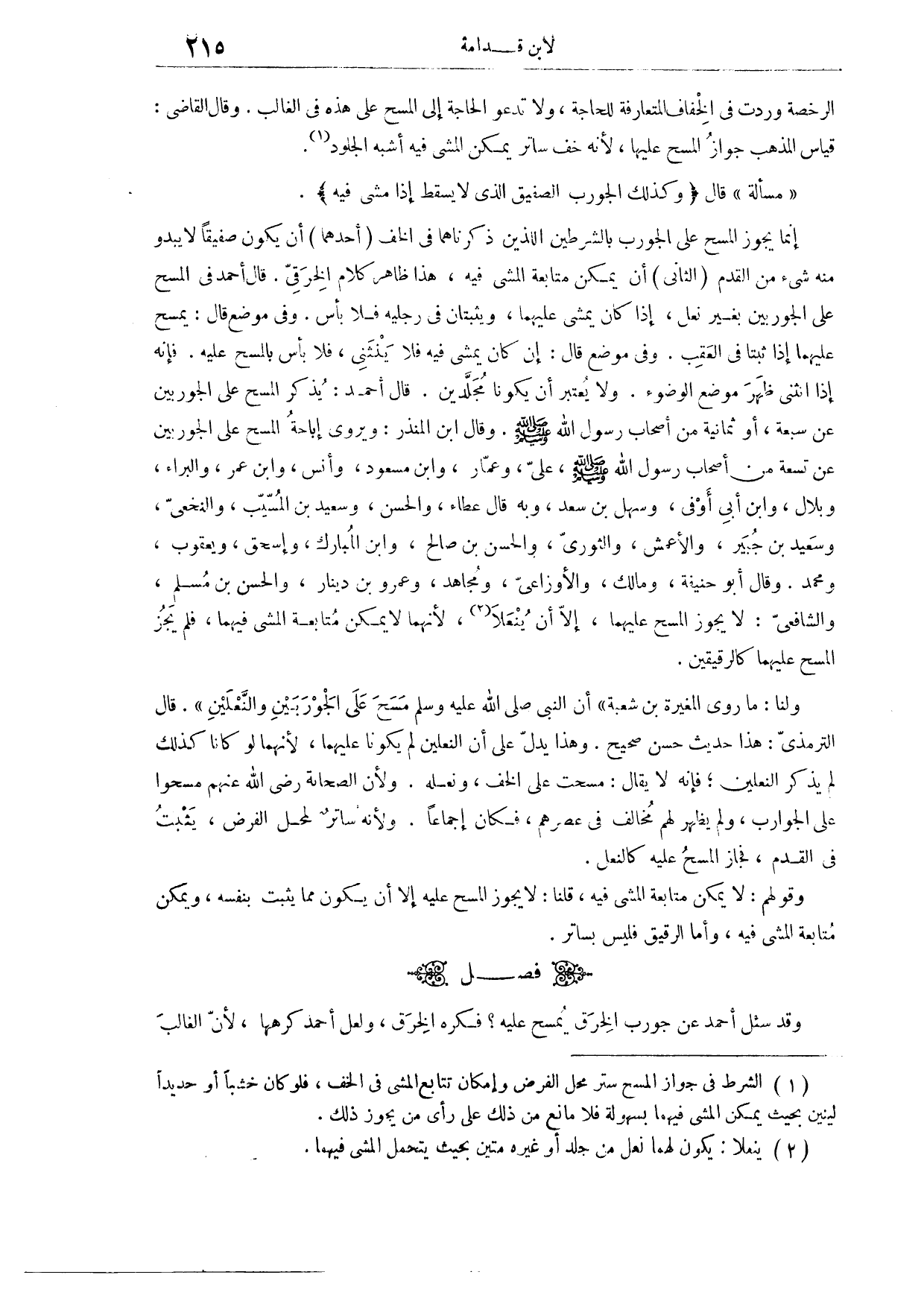 وَقَالَ ابْنُ الْمُنْذِرِ: وَيُرْوَى إبَاحَةُ الْمَسْحِ عَلَى الْجَوْرَبَيْنِ عَنْ تِسْعَةٍ مِنْ أَصْحَابِ رَسُولِ اللَّهِ - صَلَّى اللَّهُ عَلَيْهِ وَسَلَّمَ -؛ عَلِيٍّ، وَعَمَّارٍ، وَابْنِ مَسْعُودٍ، وَأَنَسٍ، وَابْنِ عُمَرَ، وَالْبَرَاءِ، وَبِلَالٍ، وَابْنِ أَبِي أَوْفَى، وَسَهْلِ بْنِ سَعْدٍ، وَبِهِ قَالَ عَطَاءٌ، وَالْحَسَنُ وَسَعِيدُ بْنُ الْمُسَيِّبِ، وَالنَّخَعِيُّ، وَسَعِيدُ بْنُ جُبَيْرٍ، وَالْأَعْمَشُ، وَالثَّوْرِيُّ، وَالْحَسَنُ بْنُ صَالِحٍ، وَابْنُ الْمُبَارَكِ، وَإِسْحَاقُ، وَيَعْقُوبُ، وَمُحَمَّدٌ. وَقَالَ أَبُو حَنِيفَةَ، وَمَالِكٌ، وَالْأَوْزَاعِيُّ، وَمُجَاهِدٌ، وَعَمْرُو بْنُ دِينَارٍ، وَالْحَسَنُ بْنُ مُسْلِمٍ، وَالشَّافِعِيُّ: لَا يَجُوزُ الْمَسْحُ عَلَيْهِمَا، إلَّا أَنْ يُنْعَلَا؛ لِأَنَّهُمَا لَا يُمْكِنُ مُتَابَعَةُ الْمَشْيِ فِيهِمَا، فَلَمْ يَجُزْ الْمَسْحُ عَلَيْهِمَا، كَالرَّقِيقِينَ وَلَنَا: مَا رَوَى الْمُغِيرَةُ بْنُ شُعْبَةَ، «أَنَّ النَّبِيَّ - صَلَّى اللَّهُ عَلَيْهِ وَسَلَّمَ - مَسَحَ عَلَى الْجَوْرَبَيْنِ وَالنَّعْلَيْنِ» .