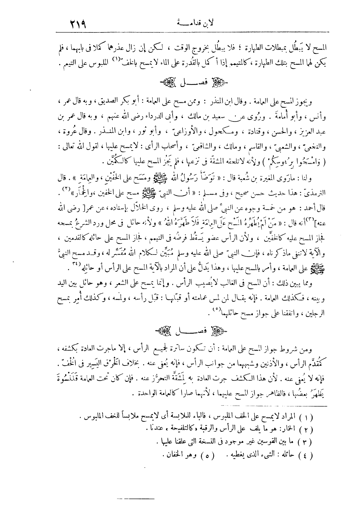 (٤٣٨) فَصْلٌ: وَيَجُوزُ الْمَسْحُ عَلَى الْعِمَامَةِ، قَالَ ابْنُ الْمُنْذِرِ: وَمِمَّنْ مَسَحَ عَلَى الْعِمَامَةِ أَبُو بَكْرٍ الصِّدِّيقُ، وَبِهِ قَالَ عُمَرُ، وَأَنَسٌ، وَأَبُو أُمَامَةَ، وَرُوِيَ عَنْ سَعْدِ بْنِ مَالِكٍ، وَأَبِي الدَّرْدَاءِ - رَضِيَ اللَّهُ عَنْهُمْ - وَبِهِ قَالَ عُمَرُ بْنُ عَبْدِ الْعَزِيزِ، وَالْحَسَنُ، وَقَتَادَةُ، وَمَكْحُولٌ، وَالْأَوْزَاعِيُّ، وَأَبُو ثَوْرٍ، وَابْنُ الْمُنْذِرِ. وَقَالَ عُرْوَةُ، وَالنَّخَعِيُّ، وَالشَّعْبِيُّ، وَالْقَاسِمُ، وَمَالِكٌ، وَالشَّافِعِيُّ، وَأَصْحَابُ الرَّأْيِ: لَا يَمْسَحُ عَلَيْهَا؛ لِقَوْلِ اللَّهِ تَعَالَى: {وَامْسَحُوا بِرُءُوسِكُمْ} [المائدة: ٦] ؛ وَلِأَنَّهُ لَا تَلْحَقُهُ الْمَشَقَّةُ فِي نَزْعِهَا، فَلَمْ يَجُزْ الْمَسْحُ عَلَيْهَا، كَالْكُمَّيْنِ.